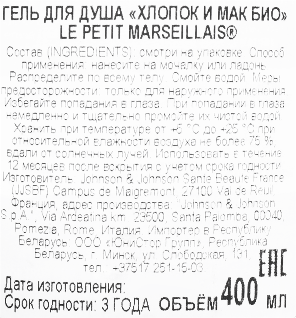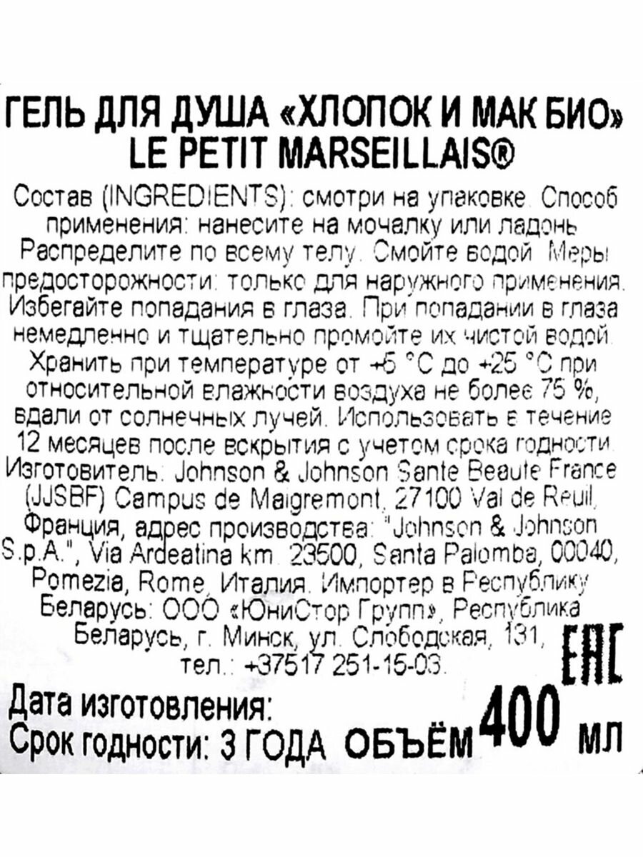 Гель для душа LE PETIT MARSEILLAIS Хлопок и мак био, 400мл, Италия, 400 мл
