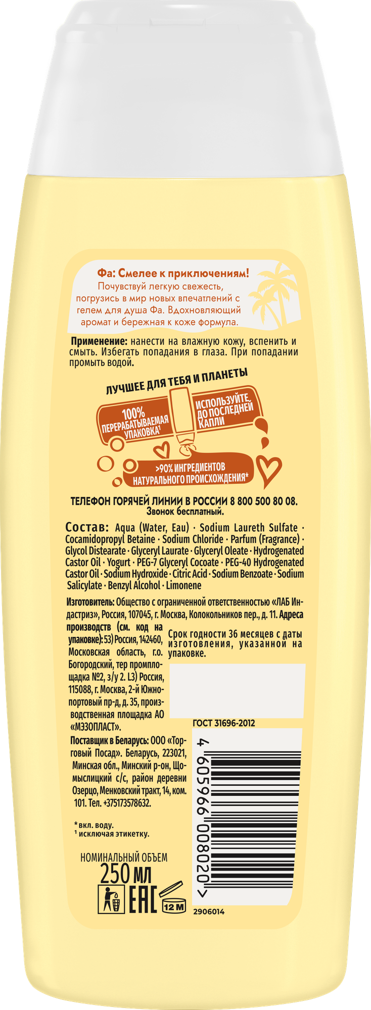 | Состав | aqua, sodium laureth sulfate, cocamidopropyl betaine, sodium chloride, yogurt, niacinamide, parfum, polyquaternium-7, propylene glycol, peg-7 glyceryl cocoate, peg-55 propylene glycol oleate, laureth-2, styrene/acrylates copolymer, citric acid, benzyl alcohol, sodium benzoate, sodium salicylate |