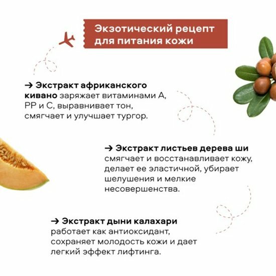 | Дополнительная информация | АРОМАТНЫЙ ПИТАТЕЛЬНЫЙ ГЕЛЬ ДЛЯ ДУША создаёт лёгкую пену, которая бережно очищает кожу. Питает её и дарит ощущение комфорта, не сушит и не стягивает. Яркий чувственный аромат подарит вдохновение! ЭКСТРАКТ ЛИСТЬЕВ ДЕРЕВА ШИ оказывает выраженное смягчающее и регенерирующее действие на кожу, устраняет шелушения и мелкие несовершенства, придаёт эластичность., ЭКСТРАКТ АФРИКАНСКОГО КИВАНО славится высоким содержанием витаминов А, РР и С, которые выравнивают тон кожи, смягчают её и придают эластичность., ЭКСТРАКТ ДЫНИ КАЛАХАРИ — источник питательных веществ и действует как антиоксидант, сохраняя молодость кожи., Оказывает лёгкий подтягивающий эффект. |