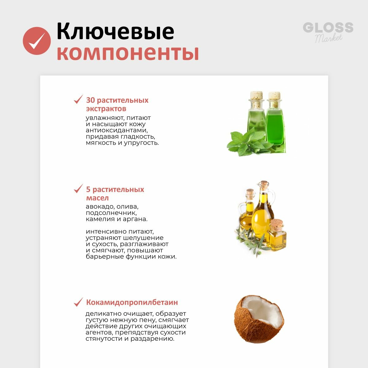 | Масла и экстракты | аргановое масло / кокосовое масло / масло авокадо / масло камелии / масло подсолнечника / оливковое масло / экстракт алоэ / экстракт жасмина / экстракт зеленого чая |
