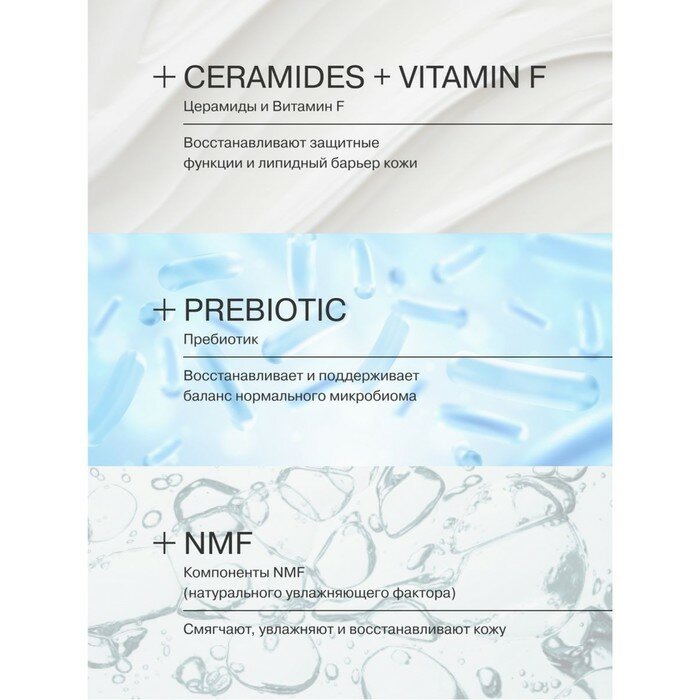 | Активный ингредиент | аллантоин / бетаин / витамин B3 (ниацинамид) / витамин E / витамин F / глицерин / глицин / лимонная кислота / линолевая кислота / липиды / магний / пребиотики / сквалан / церамиды |