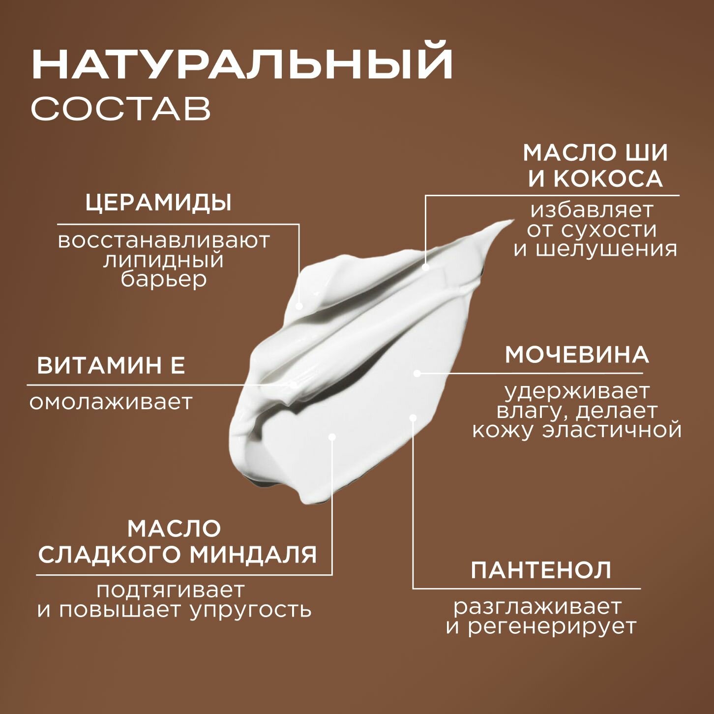 | Состав | Aqua, Butyrospermum Parkii Butter (масло ши), Theobroma Cacao Seed Butter (масло какао), Lecithin, Cocos Nucifera Oil (масло кокоса натуральное), Prunus Amygdalus Dulcis Oil (масло сладкого миндаля), Urea (мочевина), Sodium Acrylates Copolymer, Phenoxyethanol, Parfum, Сeramide 2 (церамиды), Methyl Palmitate, Tocopherol, Helianthus Annuus Seed Oil, Ethylhexylglycerin |