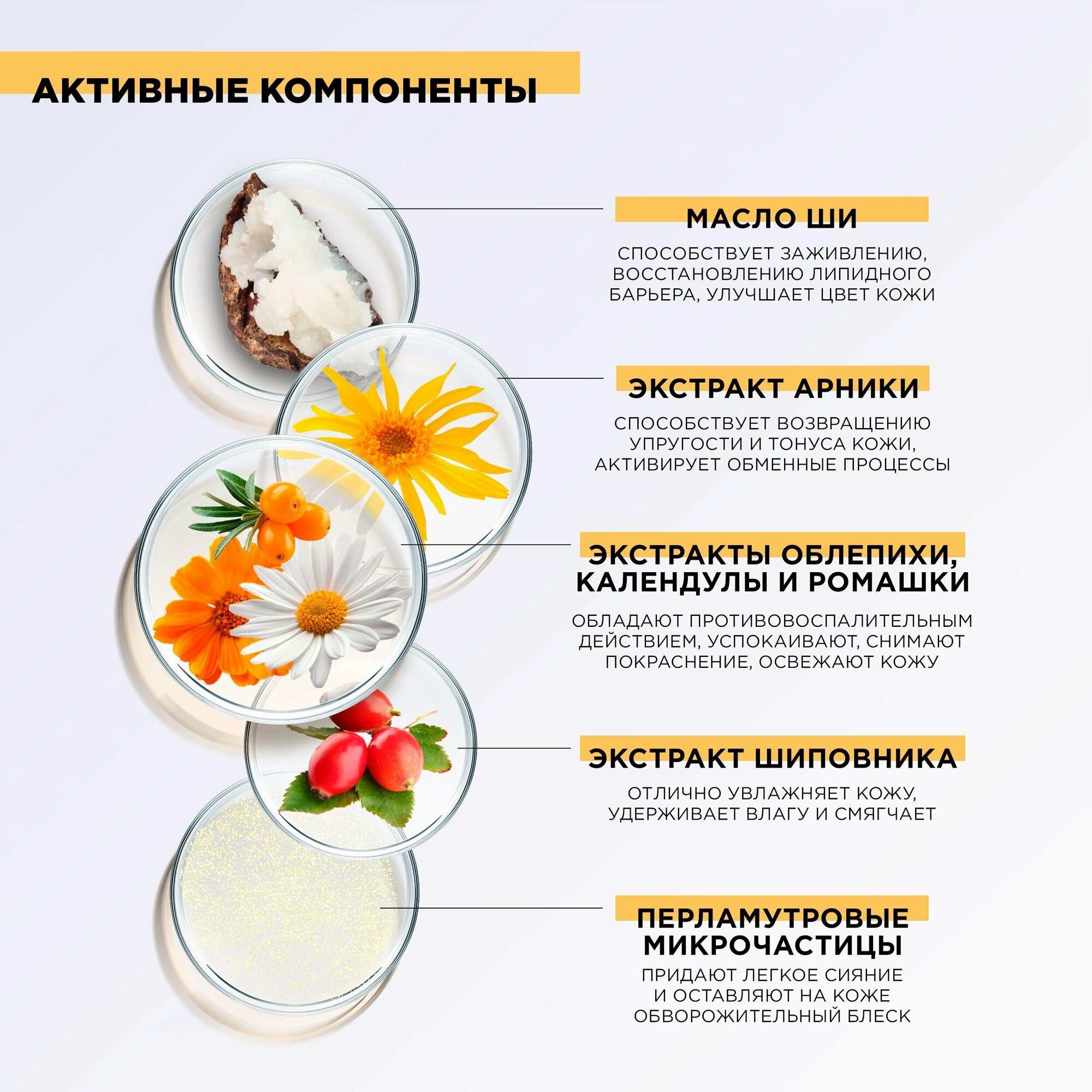 | Состав | Вода, цетеариловый спирт, растительное масло кукурузы, глицерин, глицерил стеарат, цетеарет-20, цетеарет-12, цетил пальмитат, С12-15 алкилбензоат, феноксиэтанол, этилгексилглицерин, карбамид, каприлик/каприк триглицериды, растительное масло ши, мика, бензиловый спирт, токоферол, растительные экстракты арники, облепихи, шиповника, календулы, ромашки, акриловые кроссполимеры, динатрия ЭДТА, хлорфенезин, BHT, ксантановая камедь, парфюмерная композиция, CI 19140. |