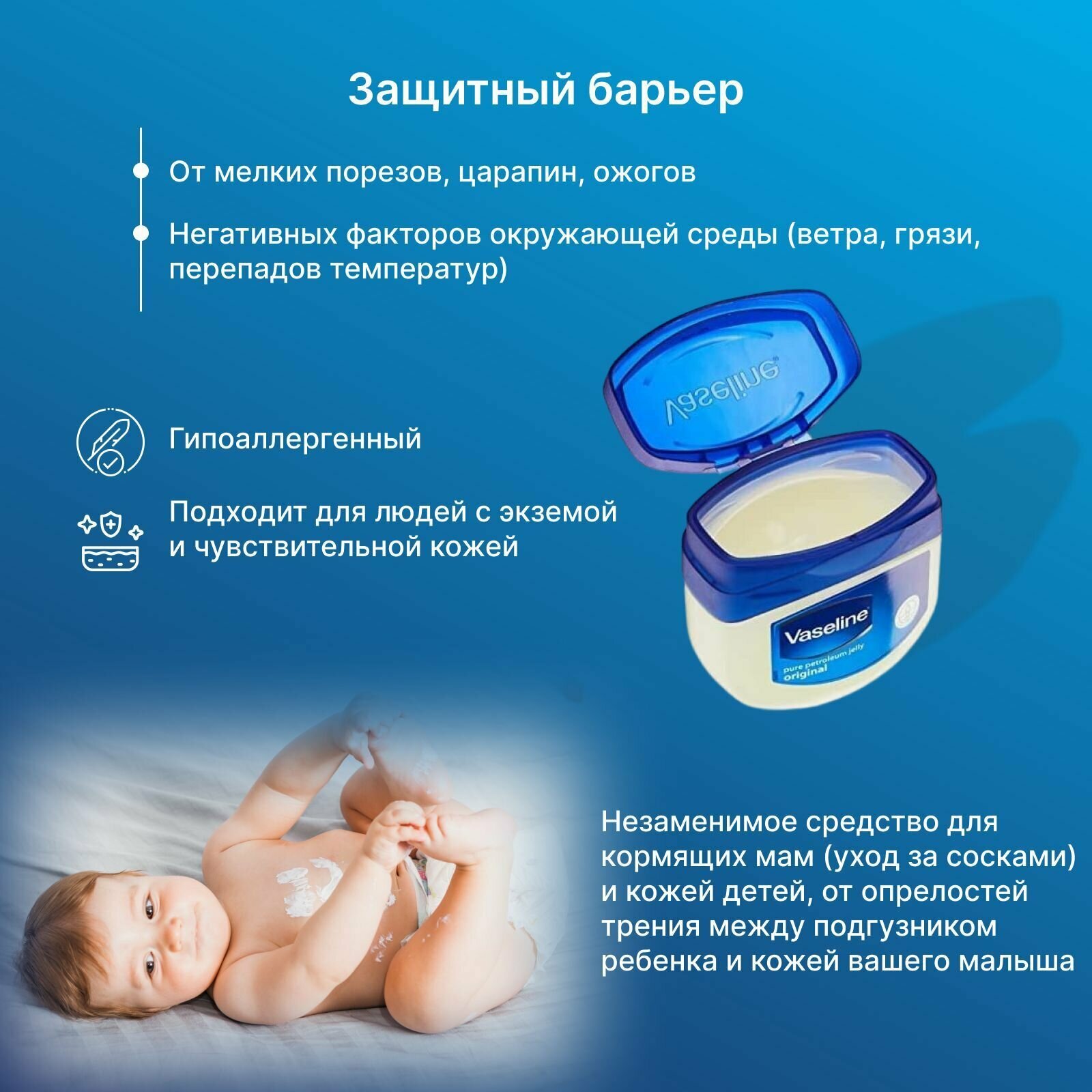 | Способ применения | Область применения вазелина огромная: можно нанести на всё, что нуждается в питании и увлажнении тела не только детей, но и взрослых. |