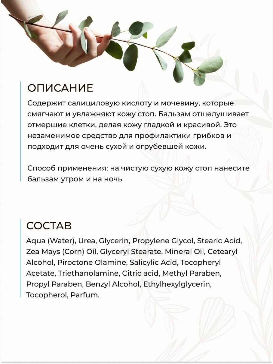 | Способ применения | на чистую сухую кожу стоп нанесите бальзам утром и на ночь. Легкими массирующими движениями втирайте в кожу стоп до полного впитывания. После нанесения вымойте руки |