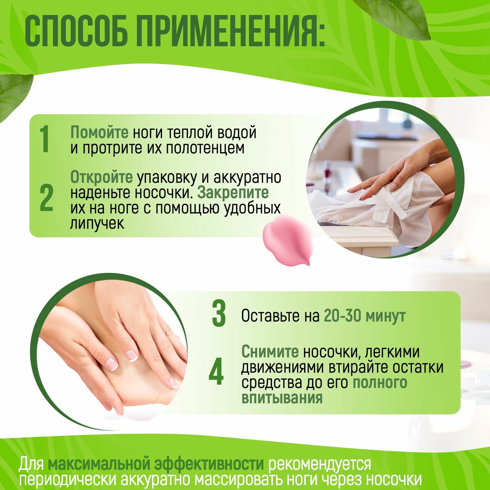 | Способ применения | Способ применения:1. Помойте ноги теплой водой и протрите их полотенцем. 2. Откройте упаковку и аккуратно наденьте носочки. Закрепите их на ноге с помощью удобных липучек3. Оставьте на 20-30 минут.Для максимальной эффективности рекомендуется периодически аккуратно массировать ноги через носочки.4. Снимите носочки, легкими движениями втирайте остатки средства до его полного впитывания. 5. Результат - гладкие пяточки |