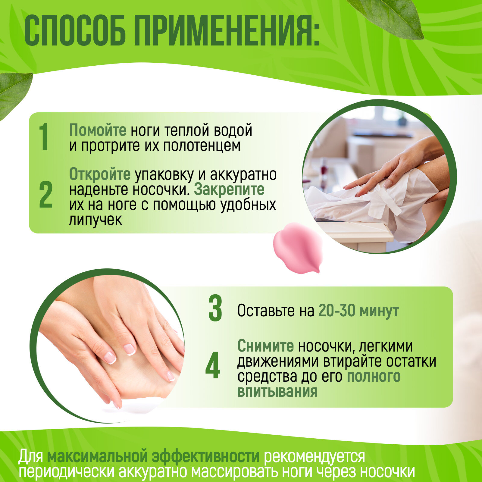 | Способ применения | Способ применения:1. Помойте ноги теплой водой и протрите их полотенцем. 2. Откройте упаковку и аккуратно наденьте носочки. Закрепите их на ноге с помощью удобных липучек3. Оставьте на 20-30 минут.Для максимальной эффективности рекомендуется периодически аккуратно массировать ноги через носочки.4. Снимите носочки, легкими движениями втирайте остатки средства до его полного впитывания. 5. Результат - гладкие пяточки |