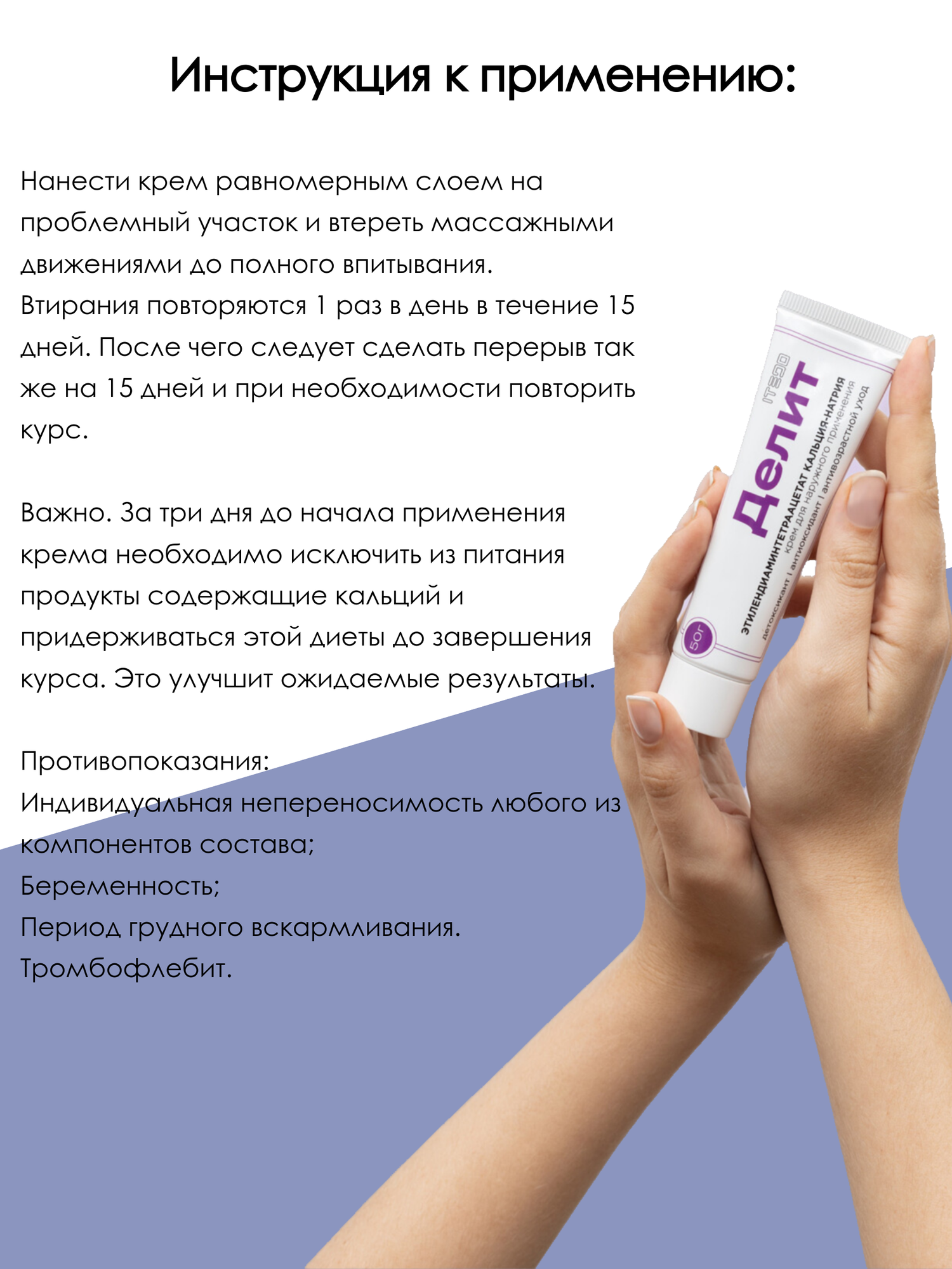 | Дополнительная информация | Рекомендуем за три дня до начала применения крема исключить из питания продукты содержащие кальций и придерживаться этой диеты до завершения курса, то это улучшит ожидаемые результаты. |
