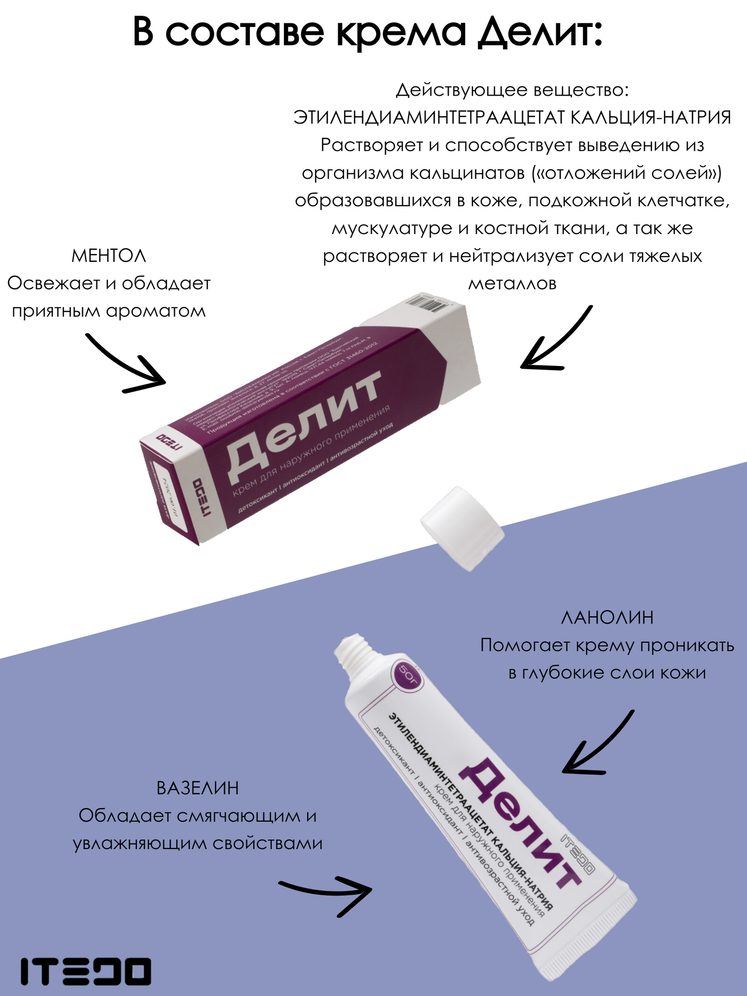 | Состав | этилендиаминтетраацетат кальция-натрия; ментол; ланолин безводный; вазелин; моноглицериды дистиллированные; вода дистиллированная |