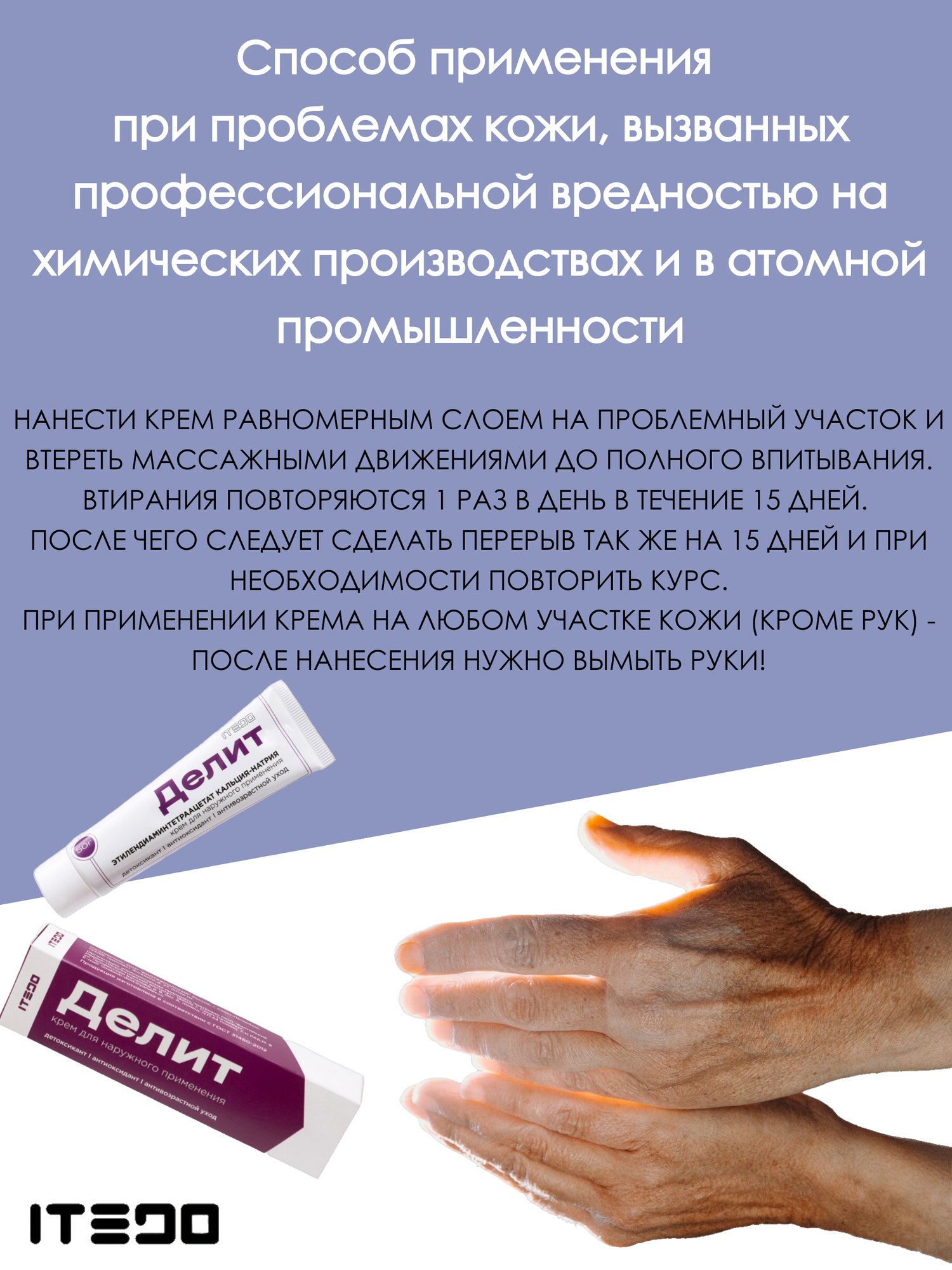 | Способ применения | Нанести крем равномерным слоем на проблемный участок и втереть массажными движениями до полного впитывания. Втирания повторяются 1 раз в день в течение 15 дней. После чего следует сделать перерыв так же на 15 дней и при необходимости повторить курс. |