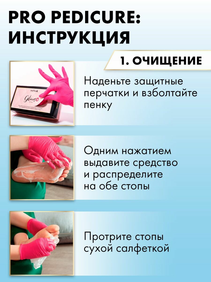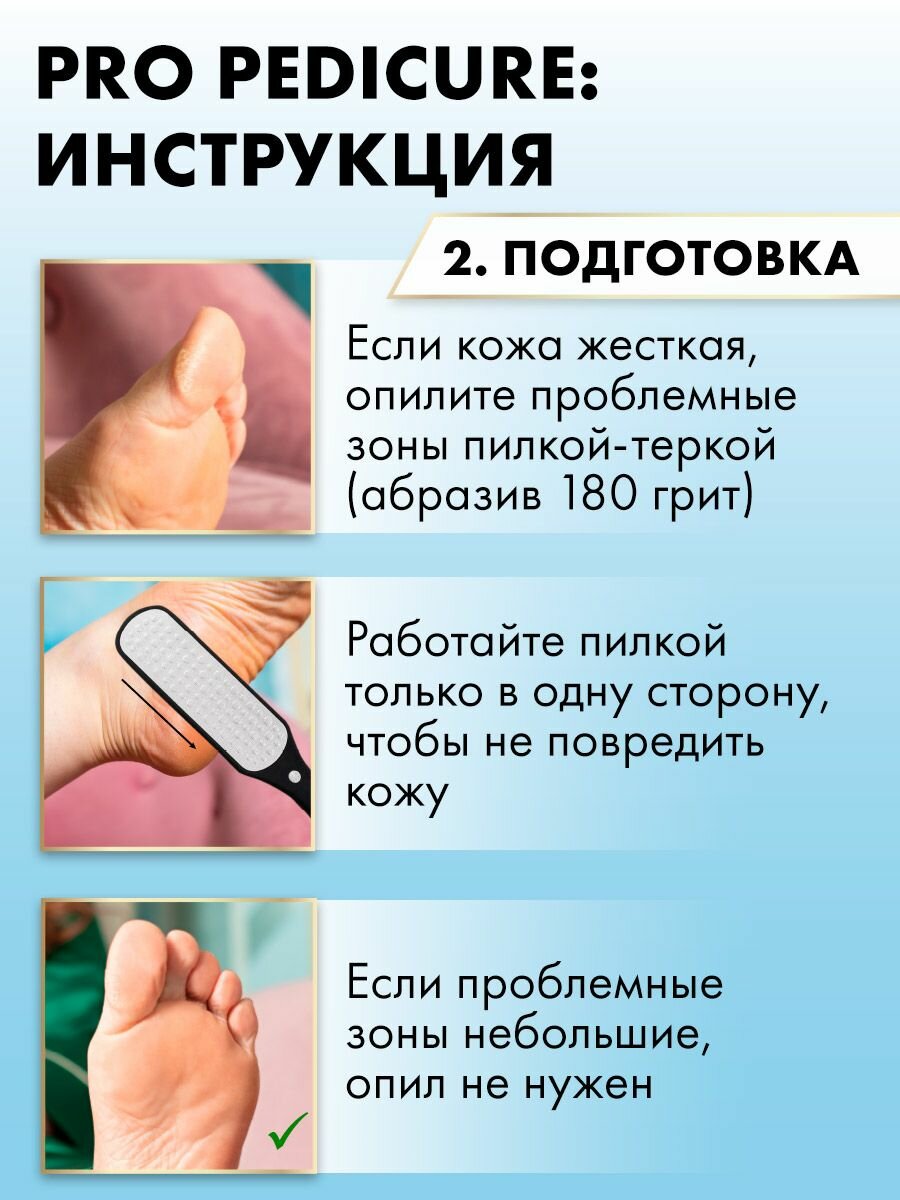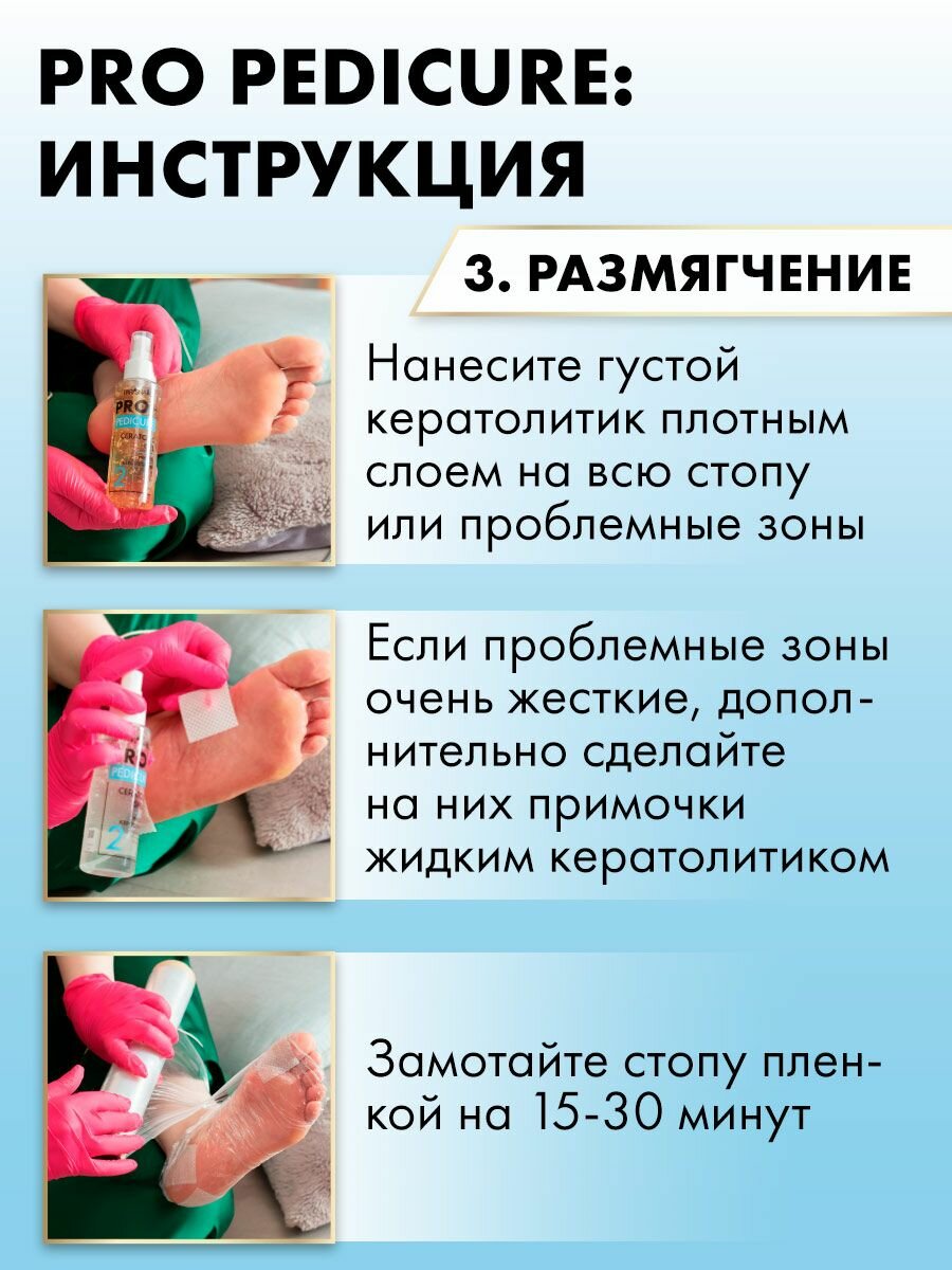 | Способ применения | • Нанесите средство по вашему желанию либо только на проблемные участки, либо на всю стопу. • Не дожидаясь высыхания средства, замотайте стопу пленкой на 5-25 минут. • По истечении времени скатайте остатки кожи при помощи педикюрной терки или аппарата (диски, фрезы, колпачки). • Можно использовать как ремувер для удаления подногтевых и околоногтевых мозолей. • Меры предосторожности: – Наносить состав в перчатках. – Не рекомендуется для самостоятельного использования лицами моложе 16 лет. – Избегать попадания в глаза. – Хранить в недоступном для детей месте. – Не использовать при глубоких повреждениях стоп (язвы, кровоточащие ранки) и грибковых заболеваниях. |