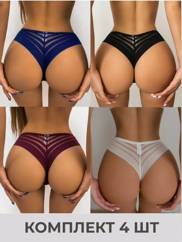 Трусы бразильяна 4 шт женские бесшовные 44-46 RU, 45–55кг, М, черные+белые+бордовые+синие