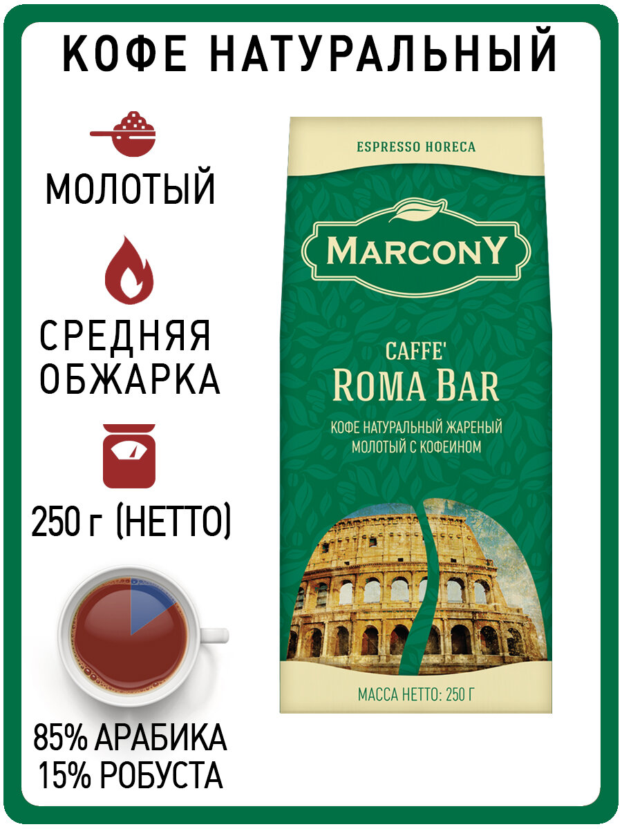 Кофе молотый MARCONY Espresso HoReCa Caffe Roma Bar 250г интересное: