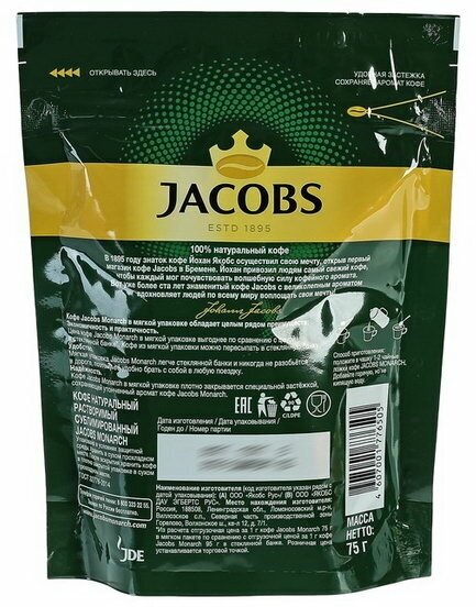Кофе растворимый Jacobs Monarch, сублимированный, дой-пак, 75 г