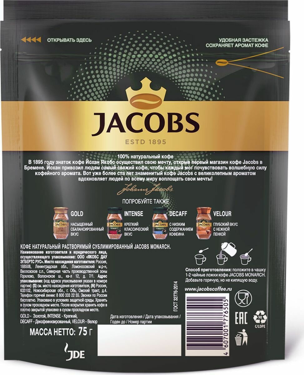 Кофе растворимый Jacobs Monarch, сублимированный, дой-пак, 75 г