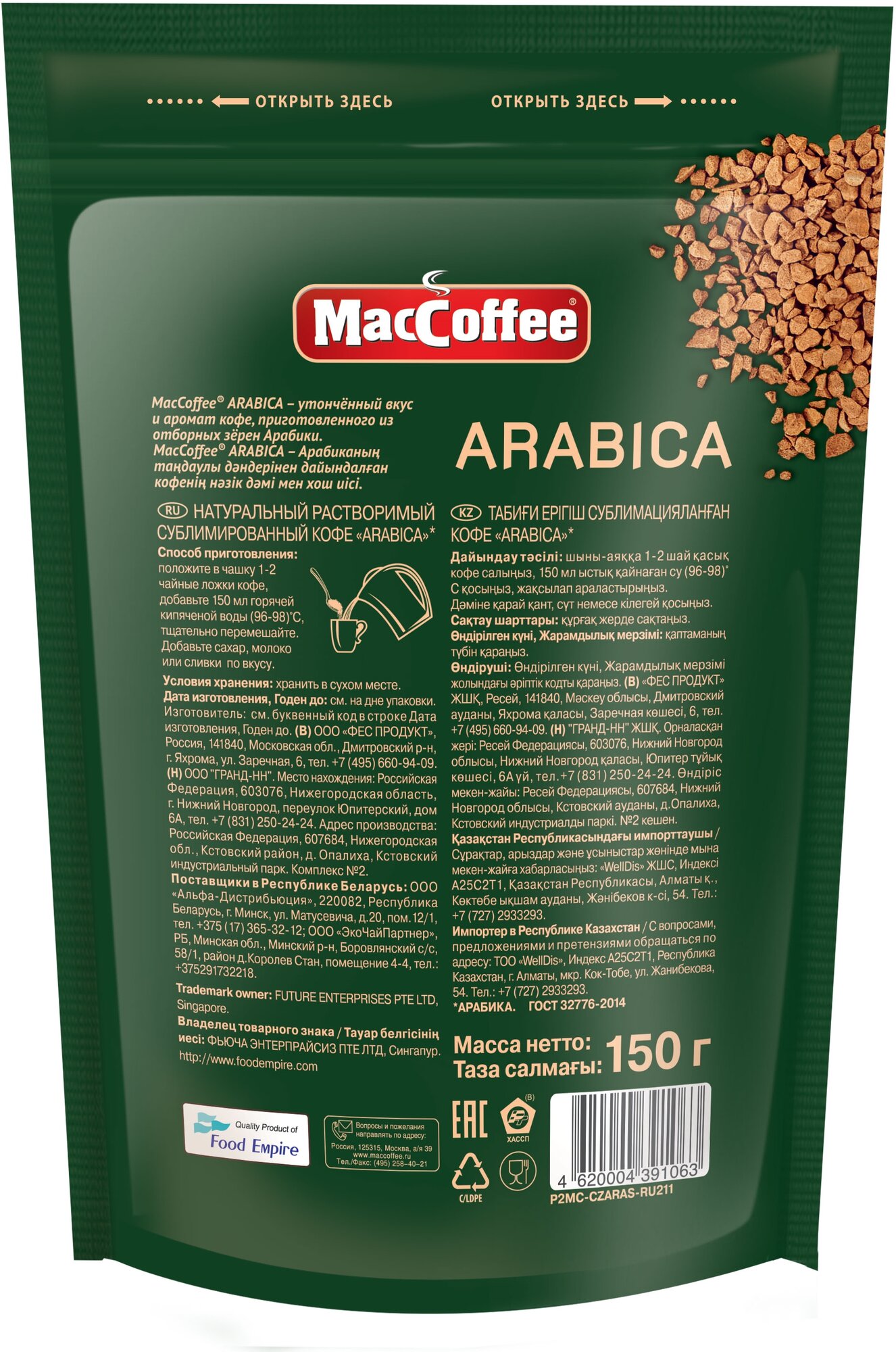 Кофе натуральный растворимый сублимированный "ARABICA" т.з. "MacCoffee", д/пак 150г