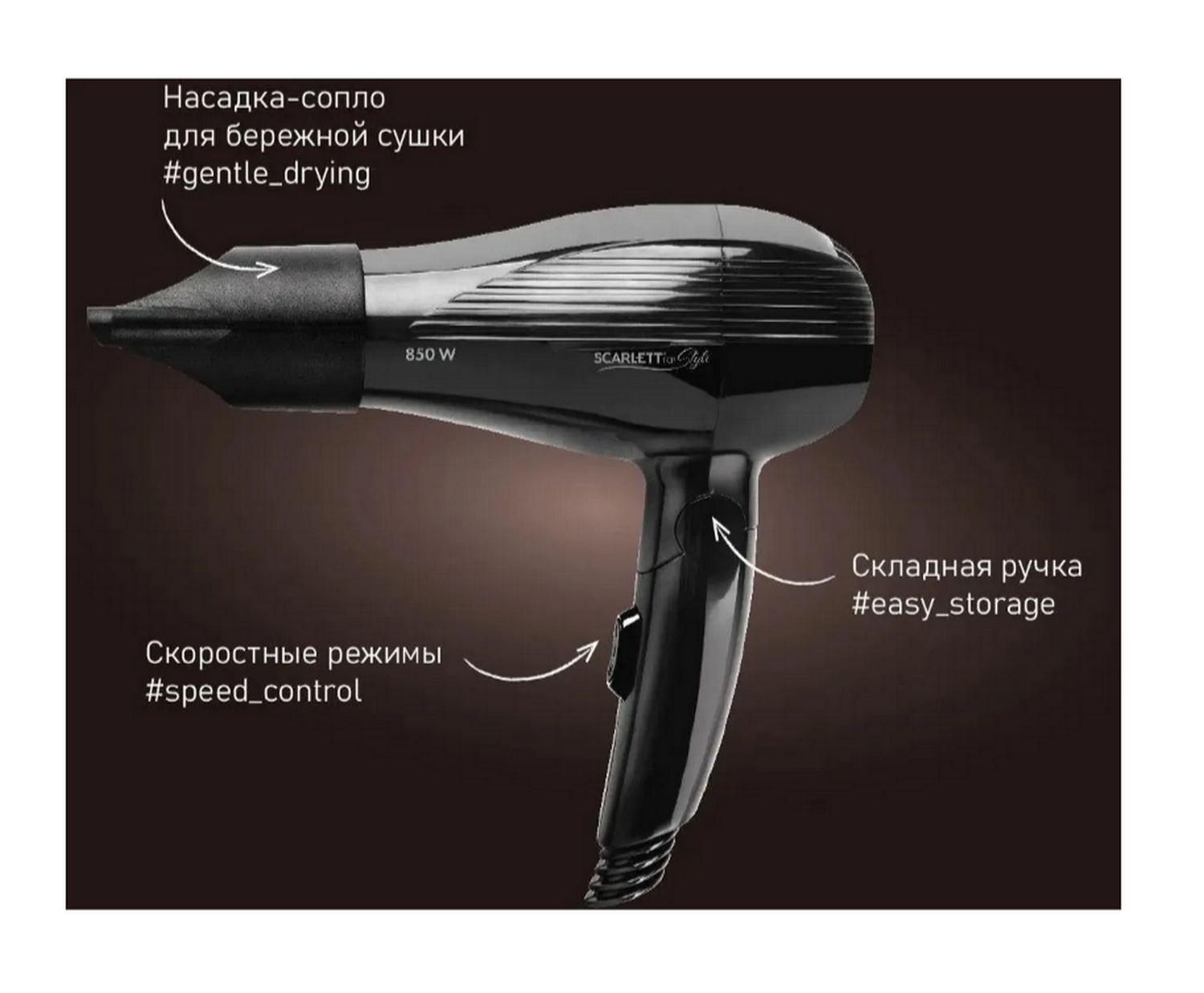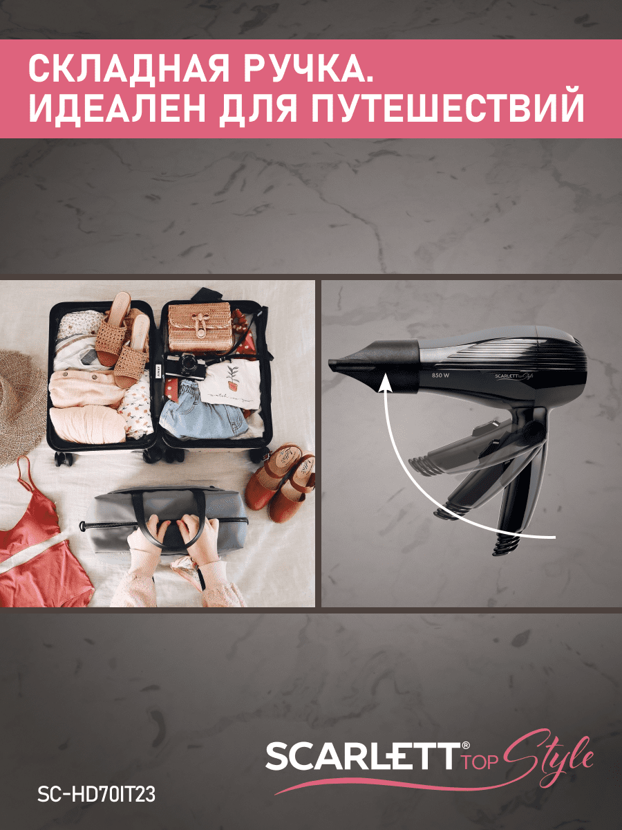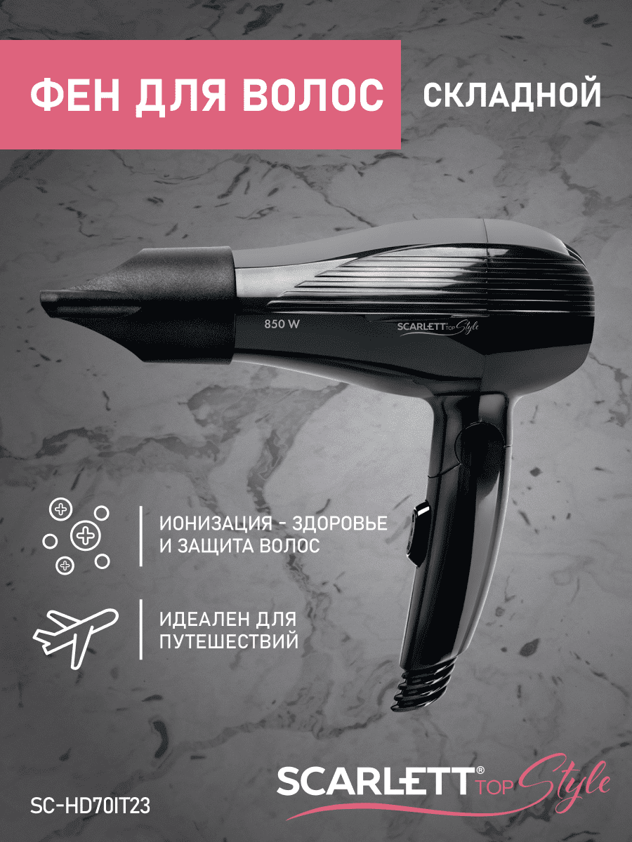Фен SCARLETT SC-HD70IT23, дорожный, 850Вт, черный