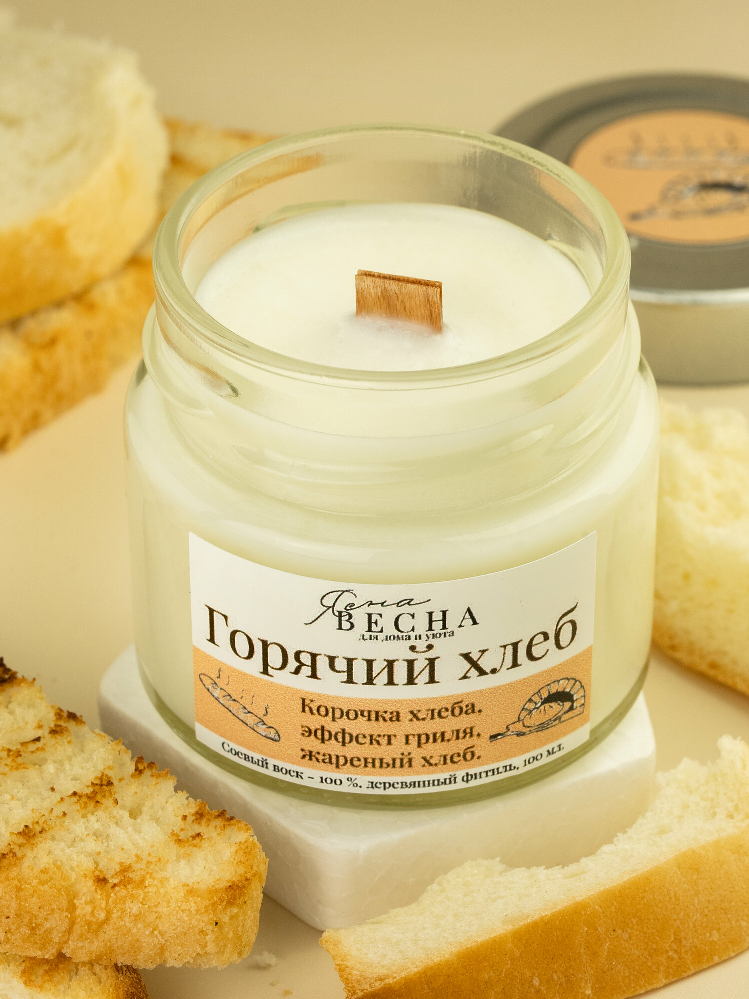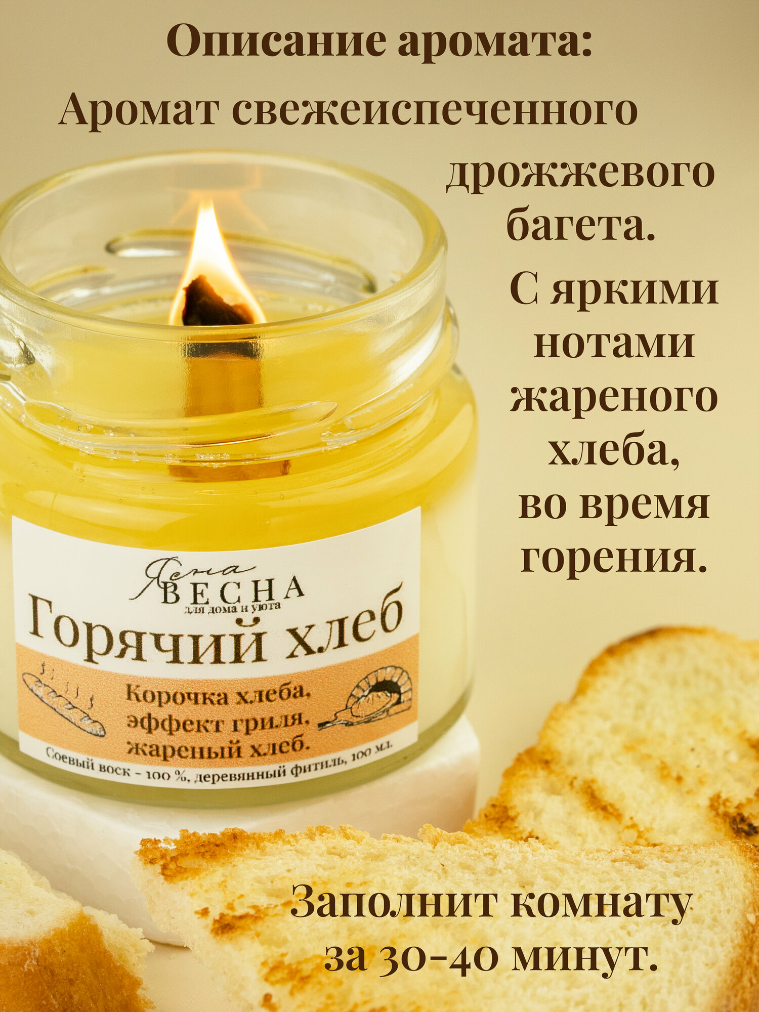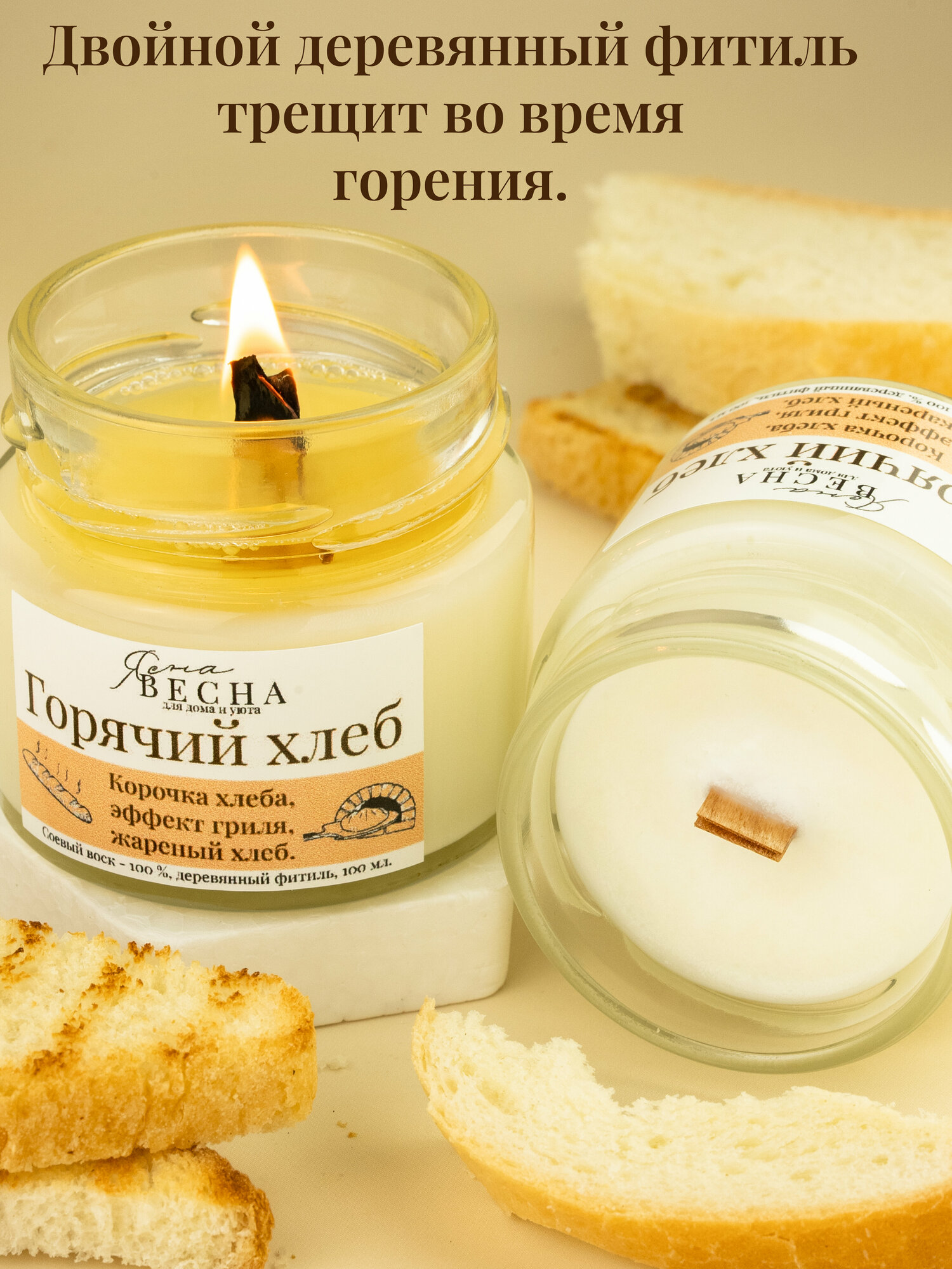 СохранитьСвеча ароматическая для дома с ароматом горячий хлеб в банке, объем 100 мл, двойной деревянный фитиль, соевый воск. интересное: