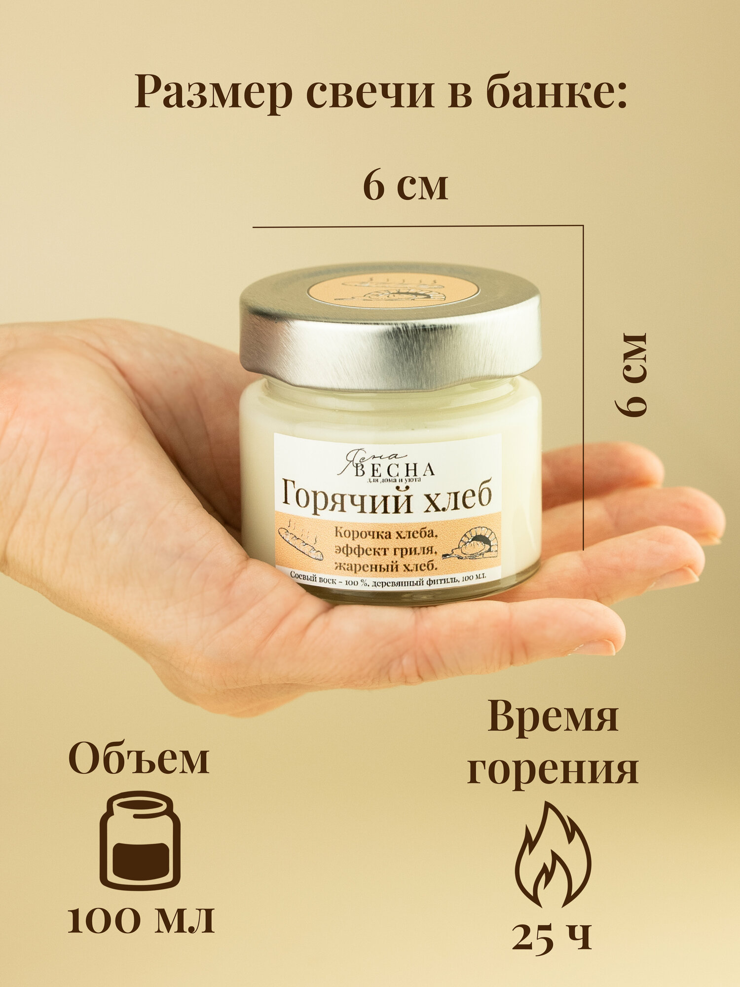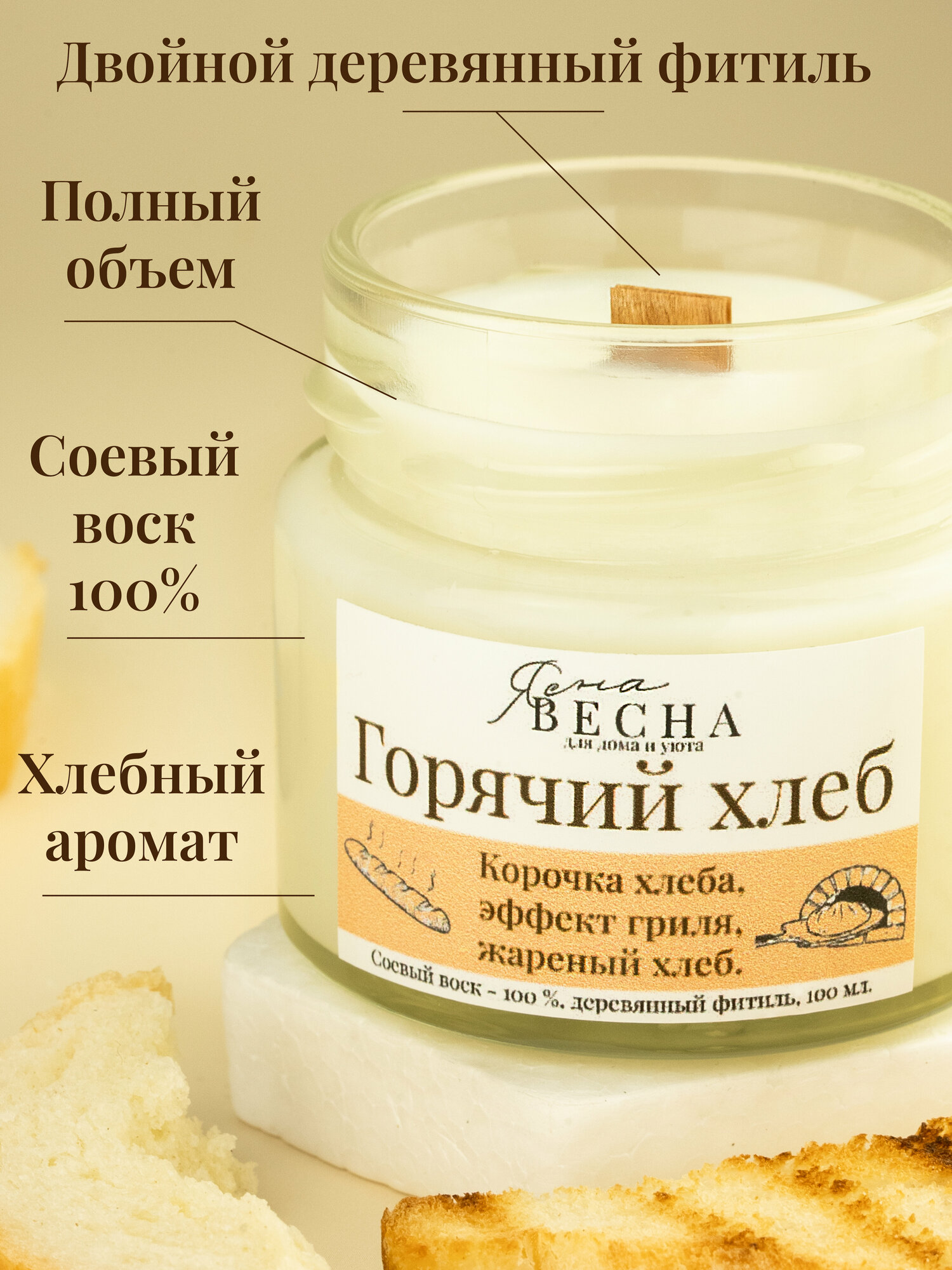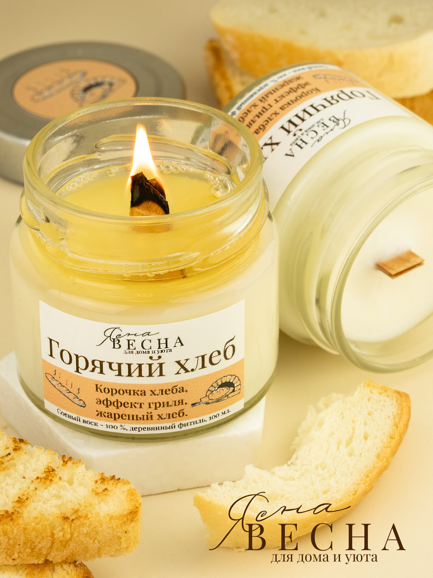 СохранитьСвеча ароматическая для дома с ароматом горячий хлеб в банке, объем 100 мл, двойной деревянный фитиль, соевый воск. интересное: