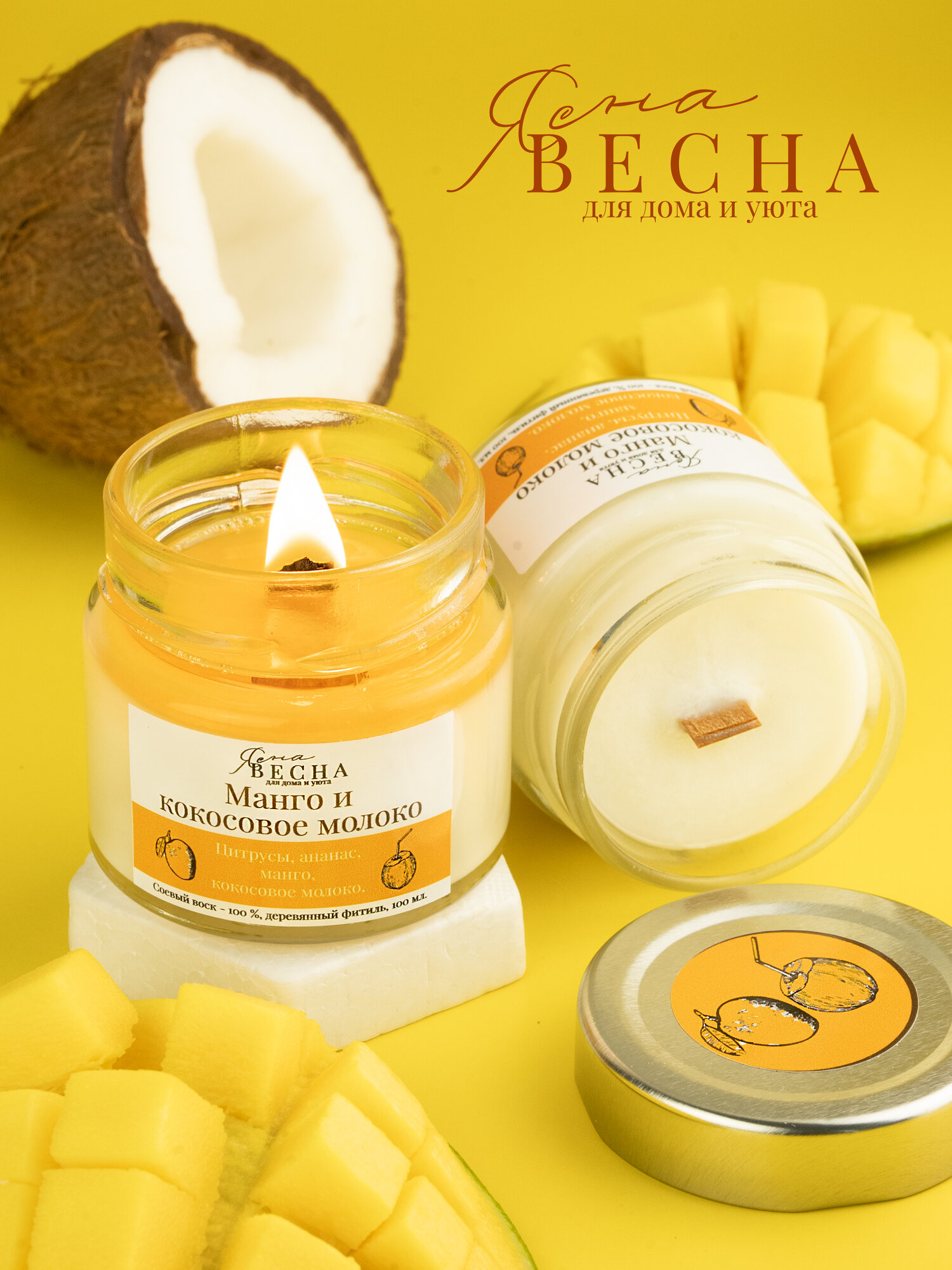 Купить Свеча ароматическая для дома с ароматом манго и кокосовое молоко в банке, объем 100 мл, двойной деревянный фитиль, соевый воск.