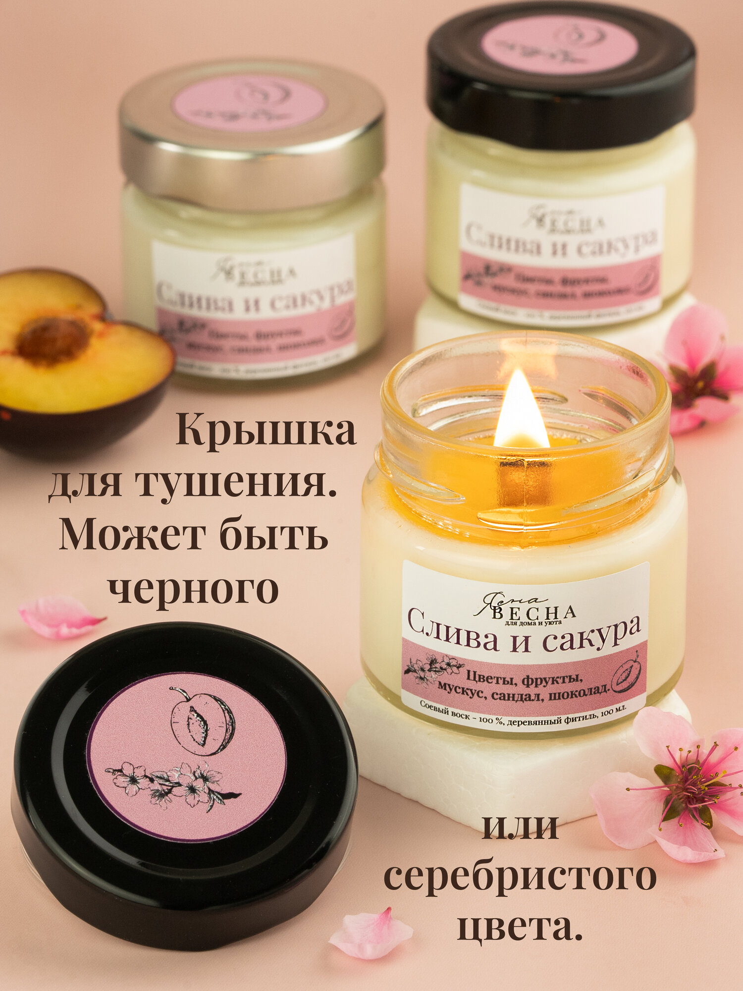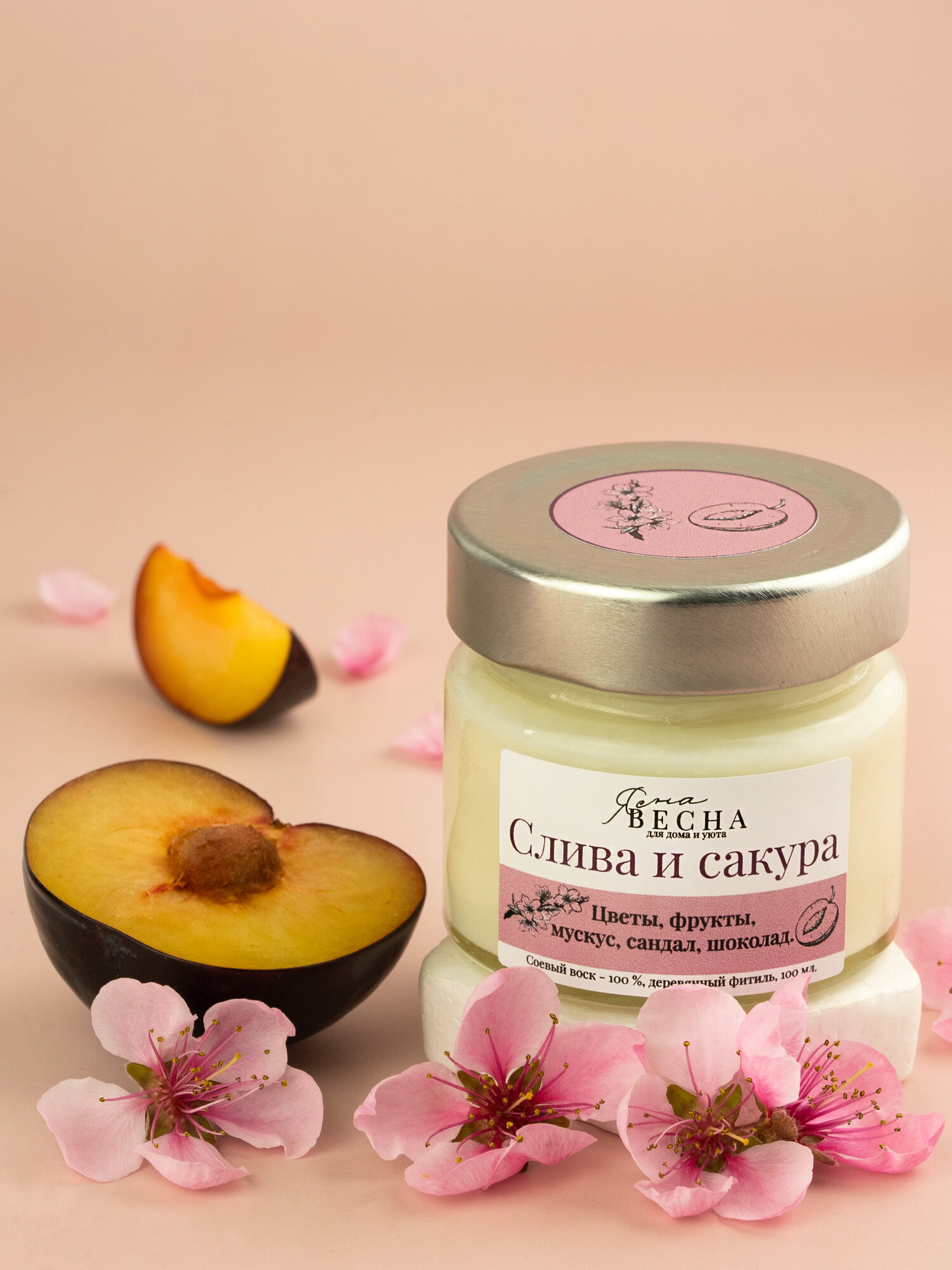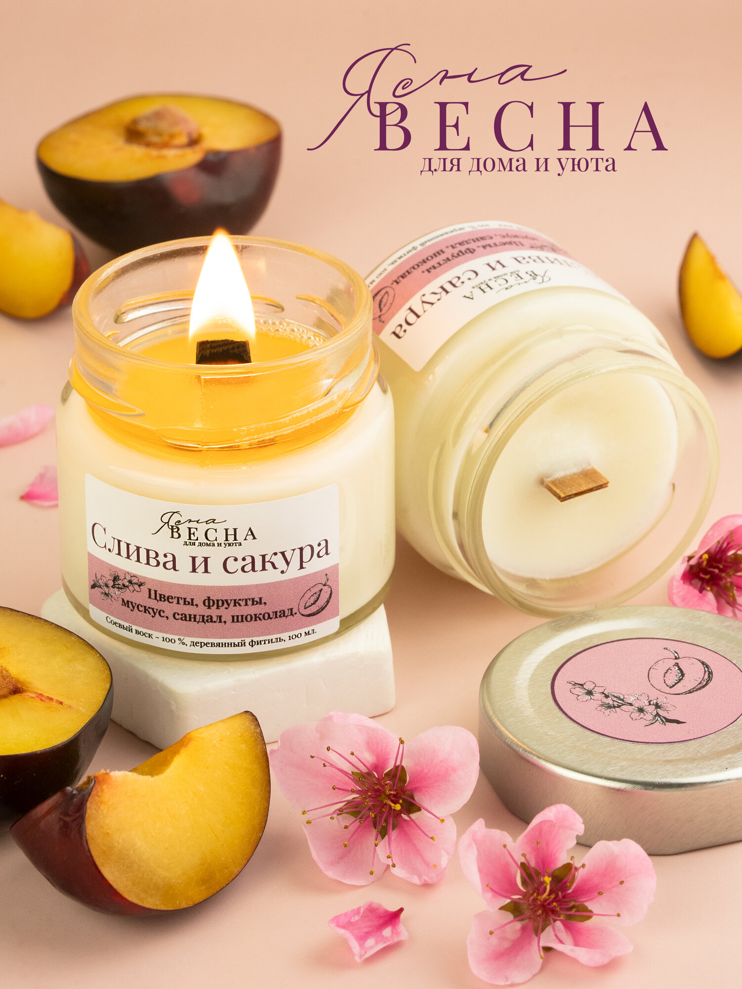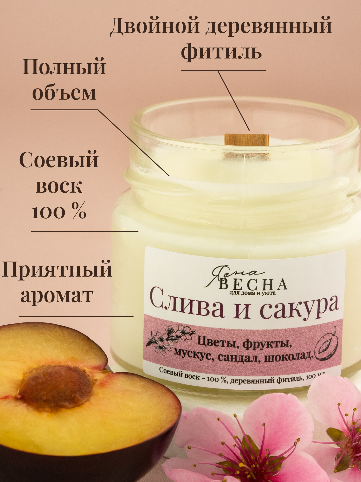 Купить Свеча ароматическая для дома с ароматом слива сакура в банке, объем 100 мл, двойной деревянный фитиль, соевый воск.