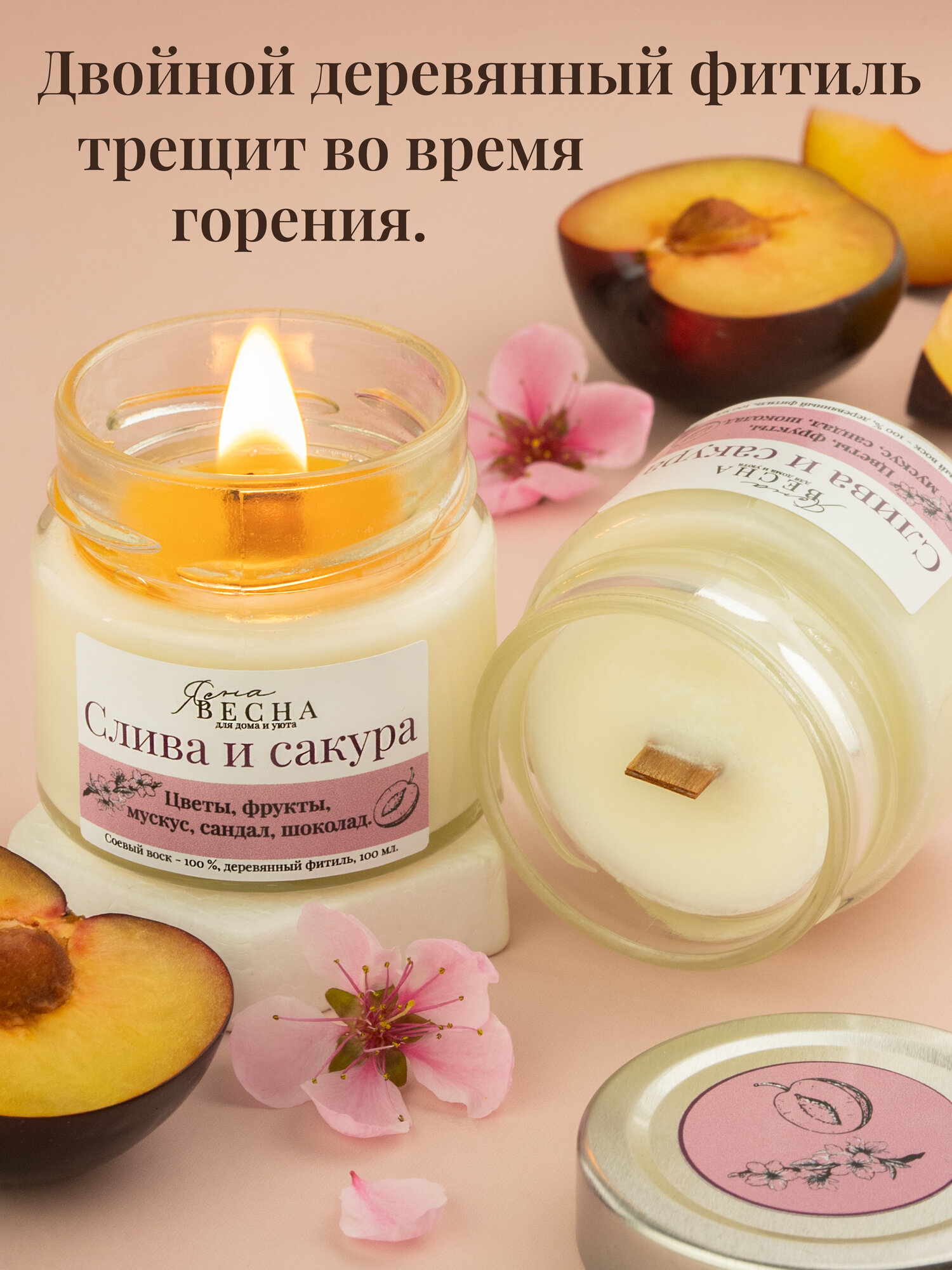 СохранитьСвеча ароматическая для дома с ароматом слива сакура в банке, объем 100 мл, двойной деревянный фитиль, соевый воск. интересное: