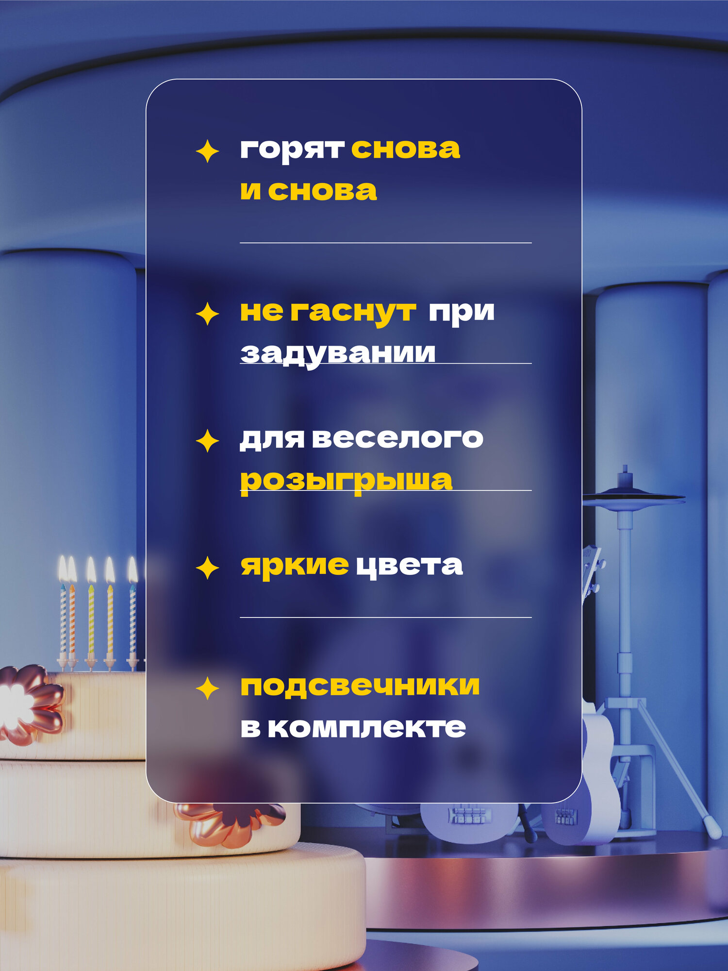 | Дополнительная информация | Свечи для торта выполнены из качественного парафина. Свечи для торта полностью безопасны и готовы к использованию. Свечи для торта несъедобны, перед употреблением десерта просим удалить свечу. |