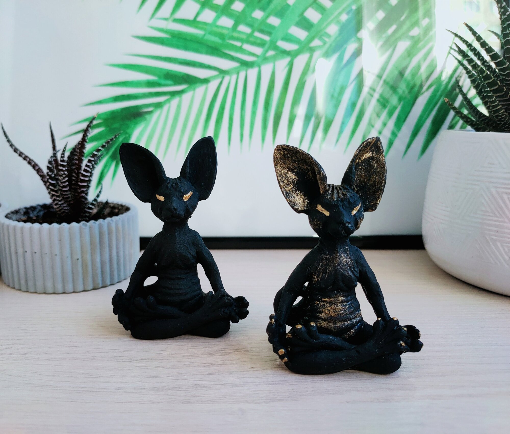 Фигурка гипсовая "Котик-сфинкс медитирующий черный матовый с позолотой", высота 7 см.