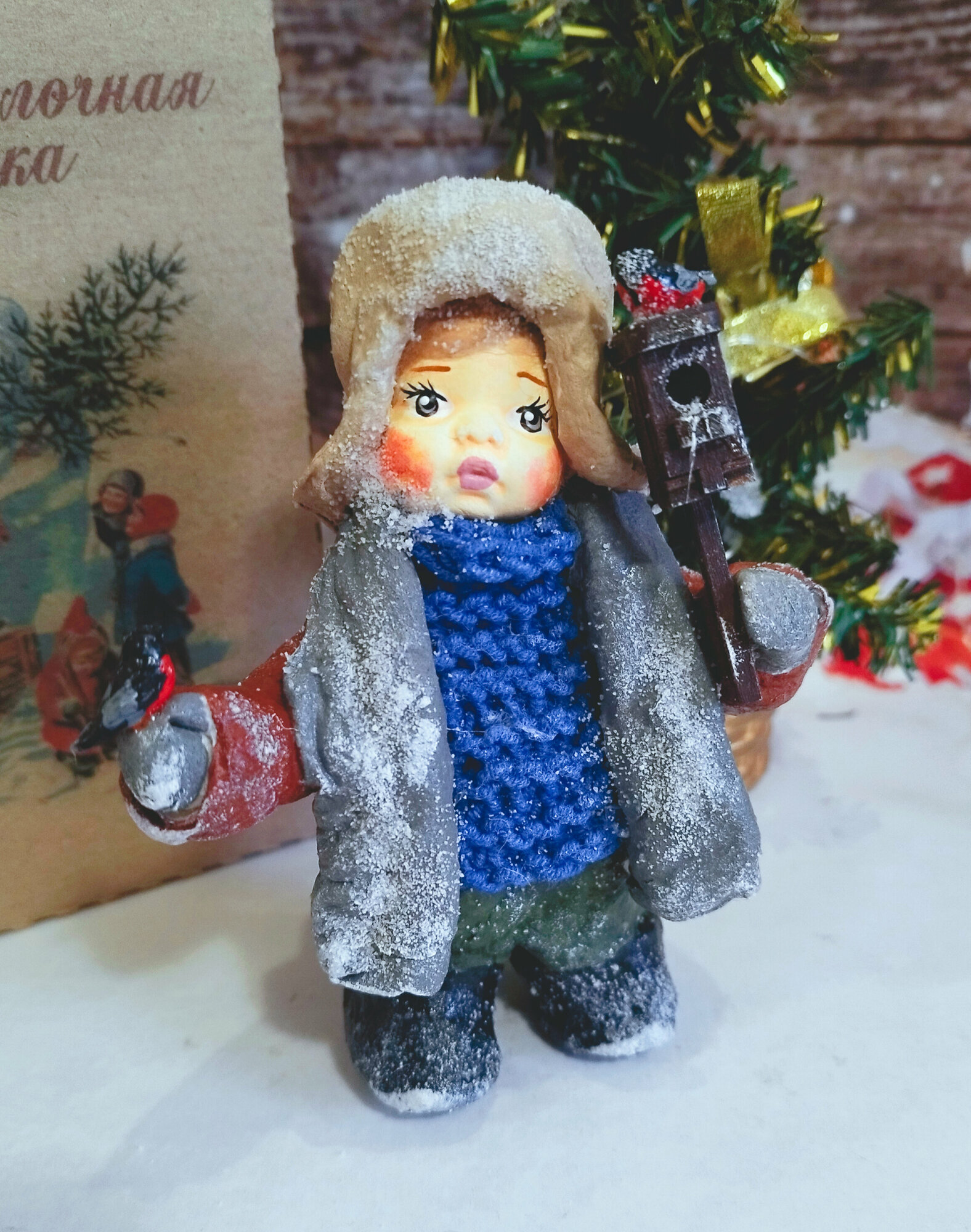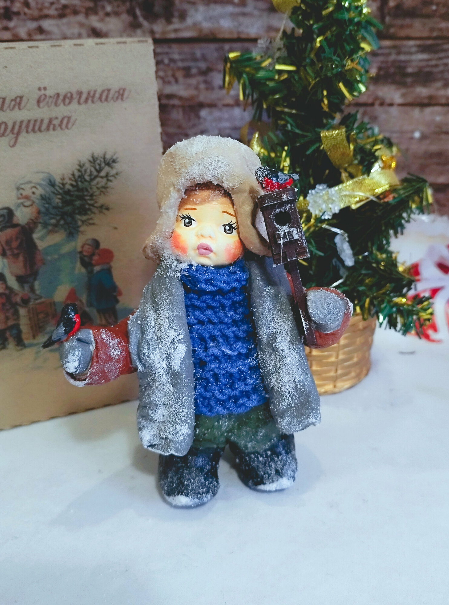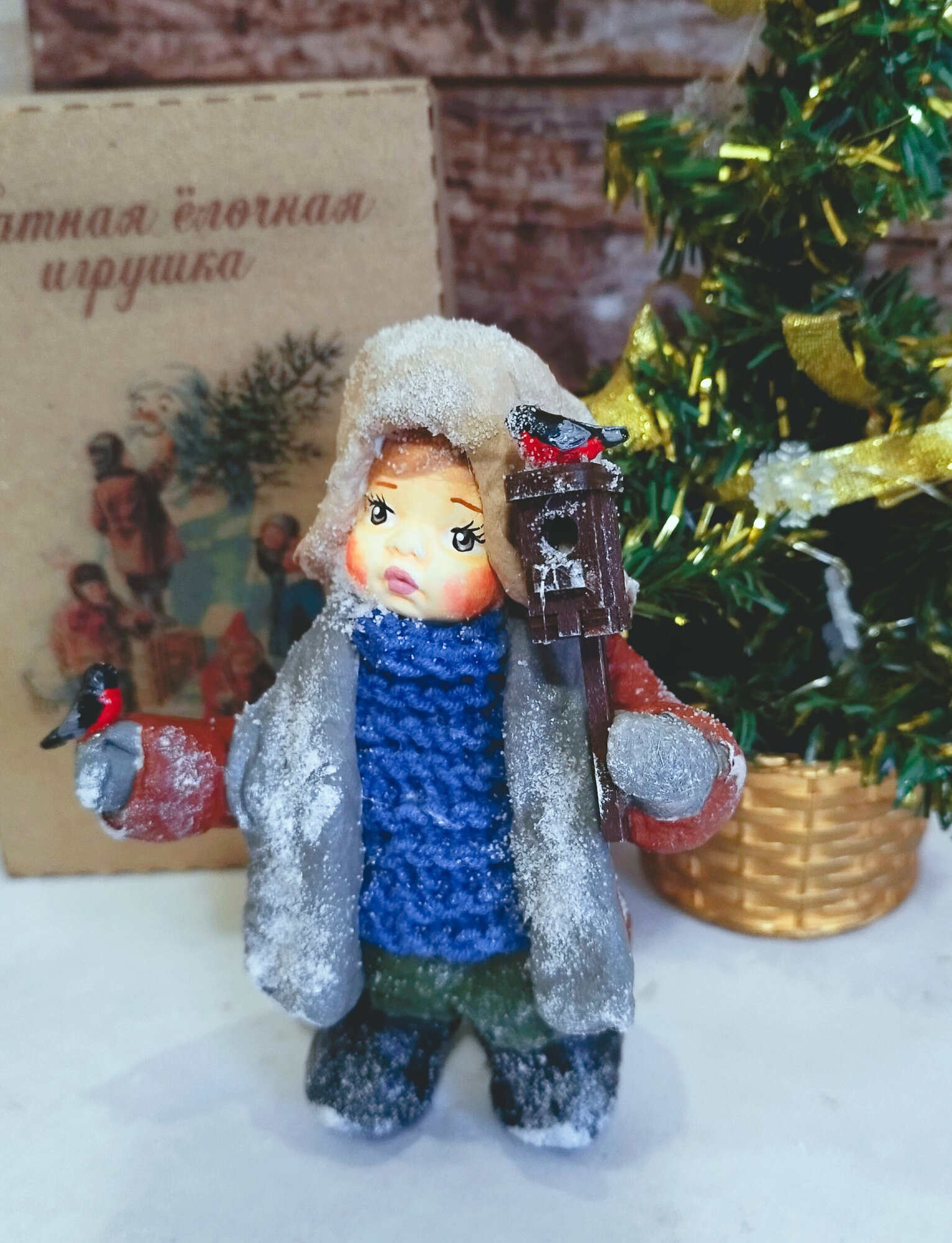 Купить Ватная елочная игрушка - малыш со скворечником