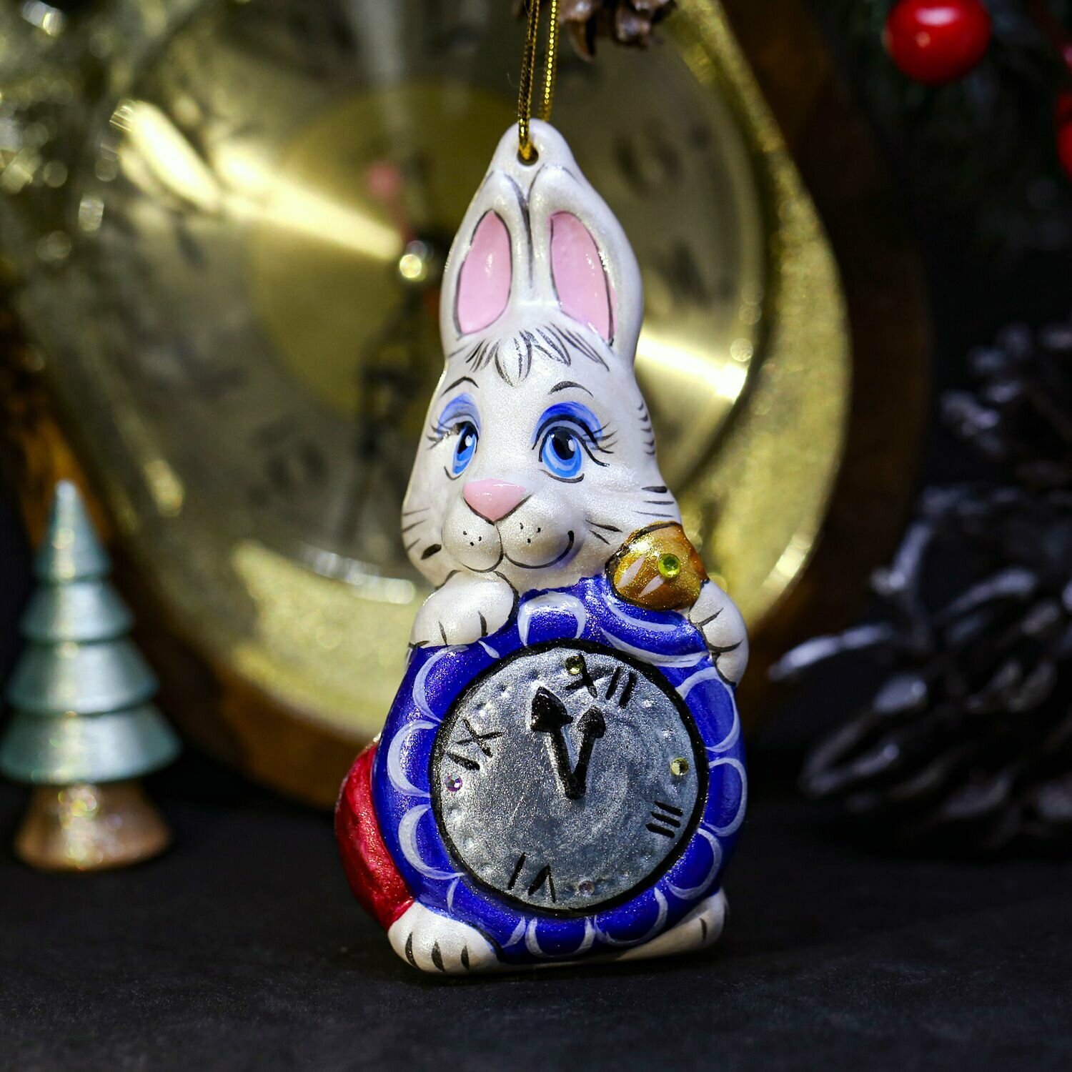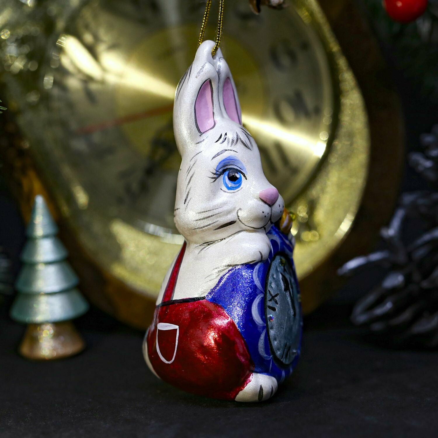 Елочная игрушка фарфоровая "Зайчик с часами" Ручная работа / Мастерская сказок интересное: