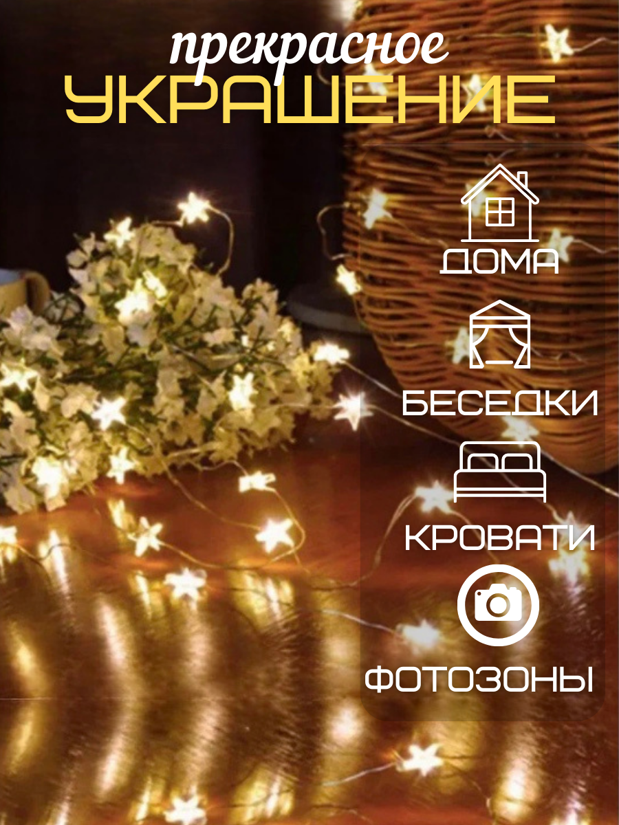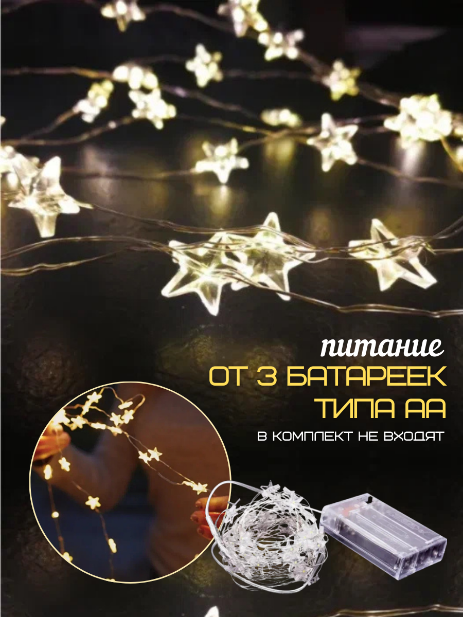 Гирлянда с маленькими звёздочками 5м тёплый свет от батареек интересное: