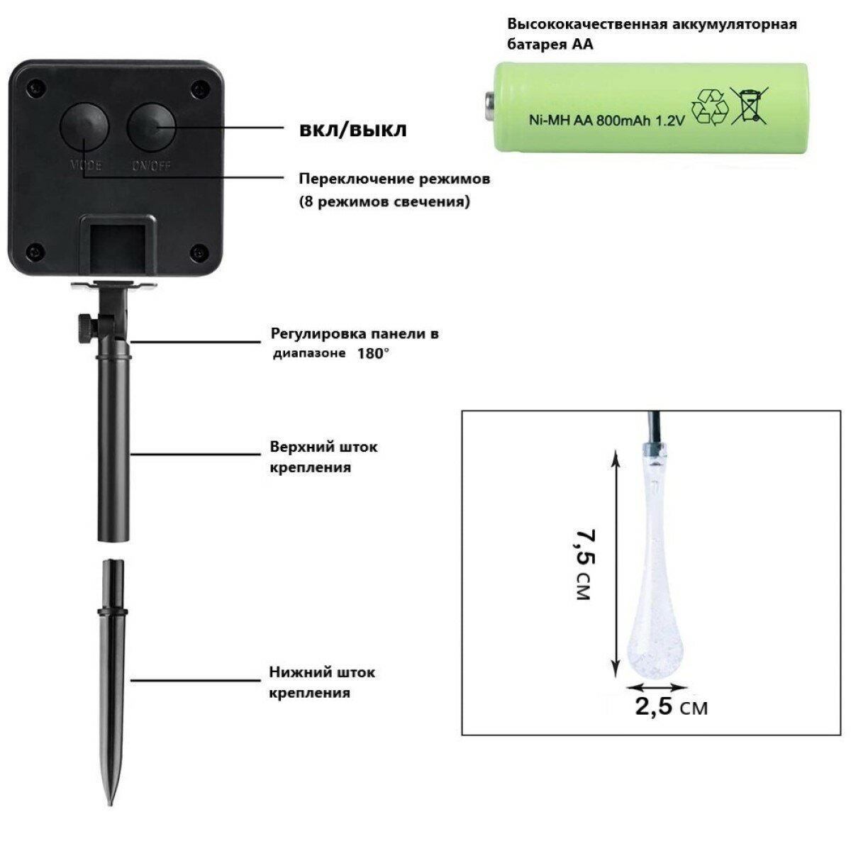 Светодиодная гирлянда в форме капель (7,3 см.) цветные на солнечной батареи 100 ламп 12 метров