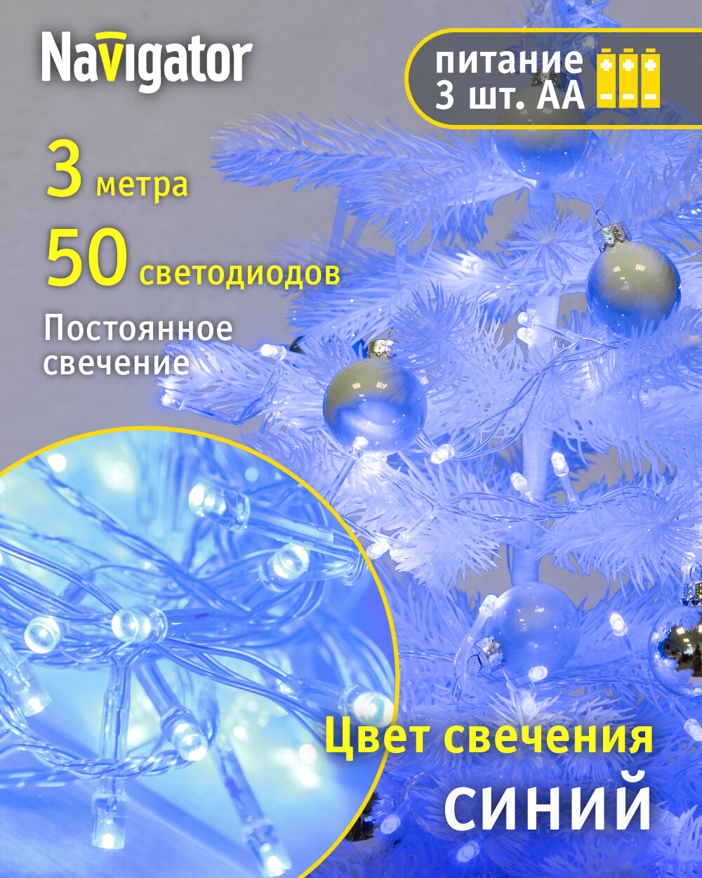 Купить Гирлянда Нить Navigator 61 802, 3м, синий свет, прозрачный провод, IP20, на батарейках