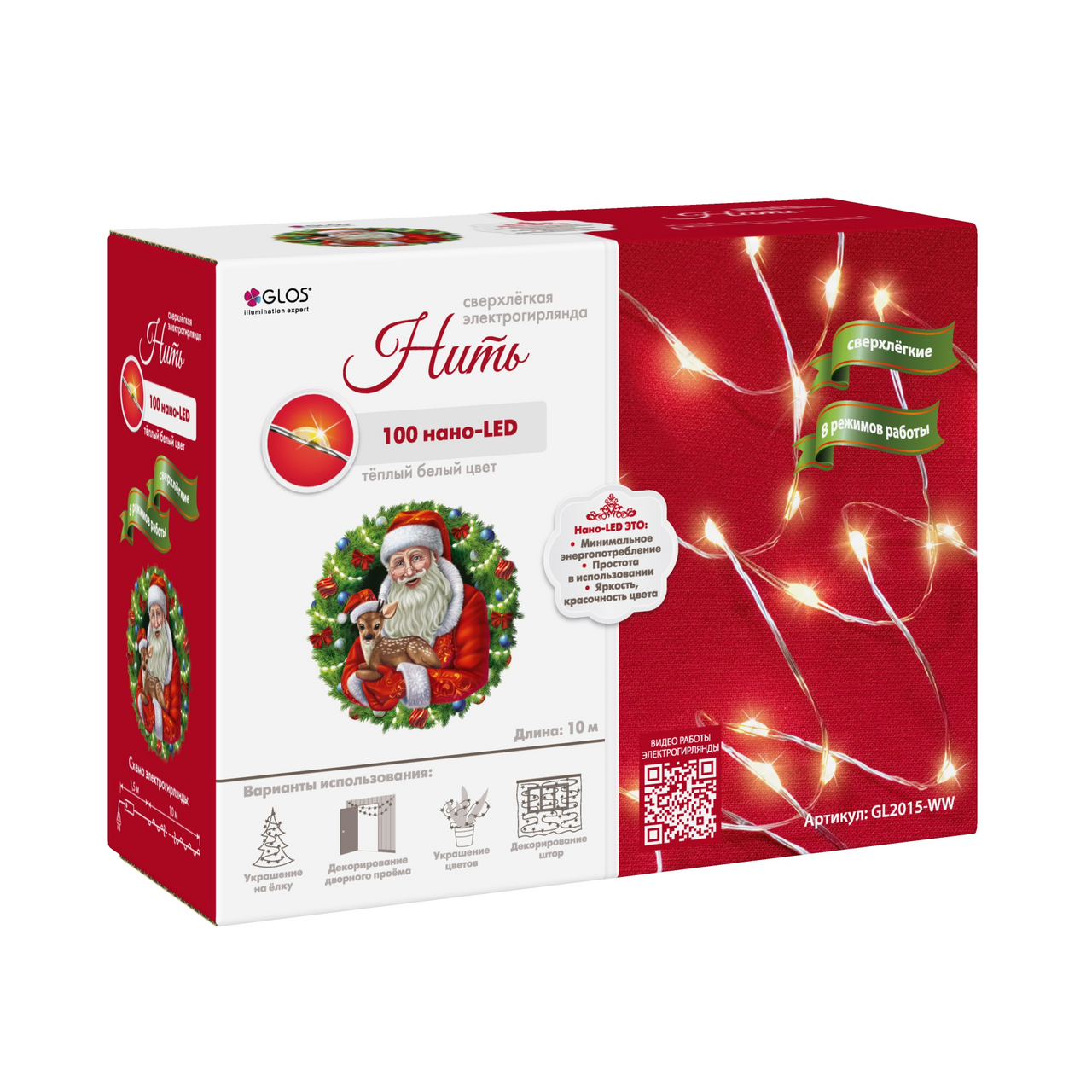 GL2015-M Электрогирлянда Нить, 10 м, 100 разноцветных нанодиодов , 8 режимов работы, для использования внутри помещений