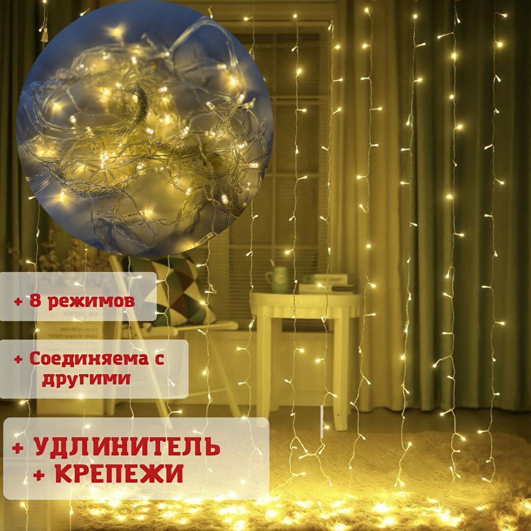 Гирлянда ROUND "Огоньки на окно" , штора светодиодная, 2x2м, 240 ламп, теплый желтый