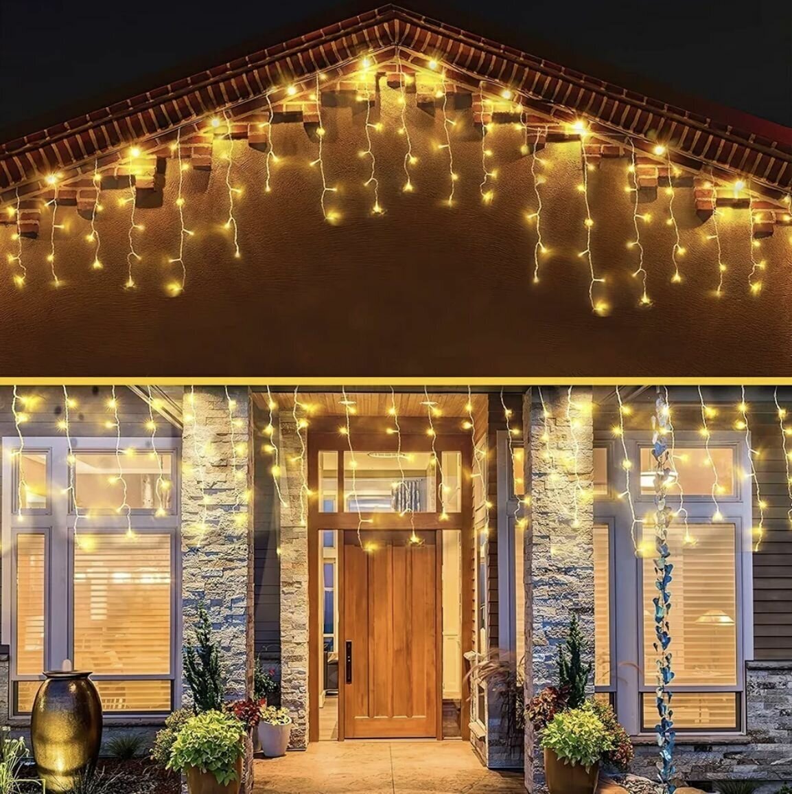 Электрогирлянда уличная Бахрома 12м / Гирлянда светодиодная, питание от сети 220В, белый провод, желтый свет
