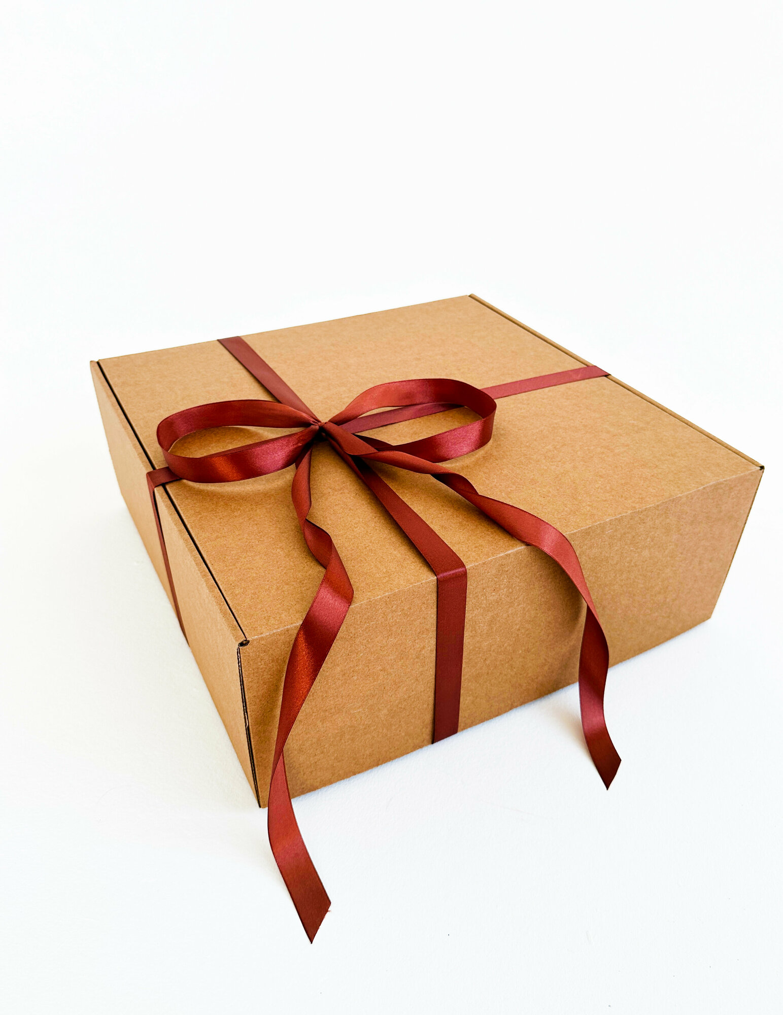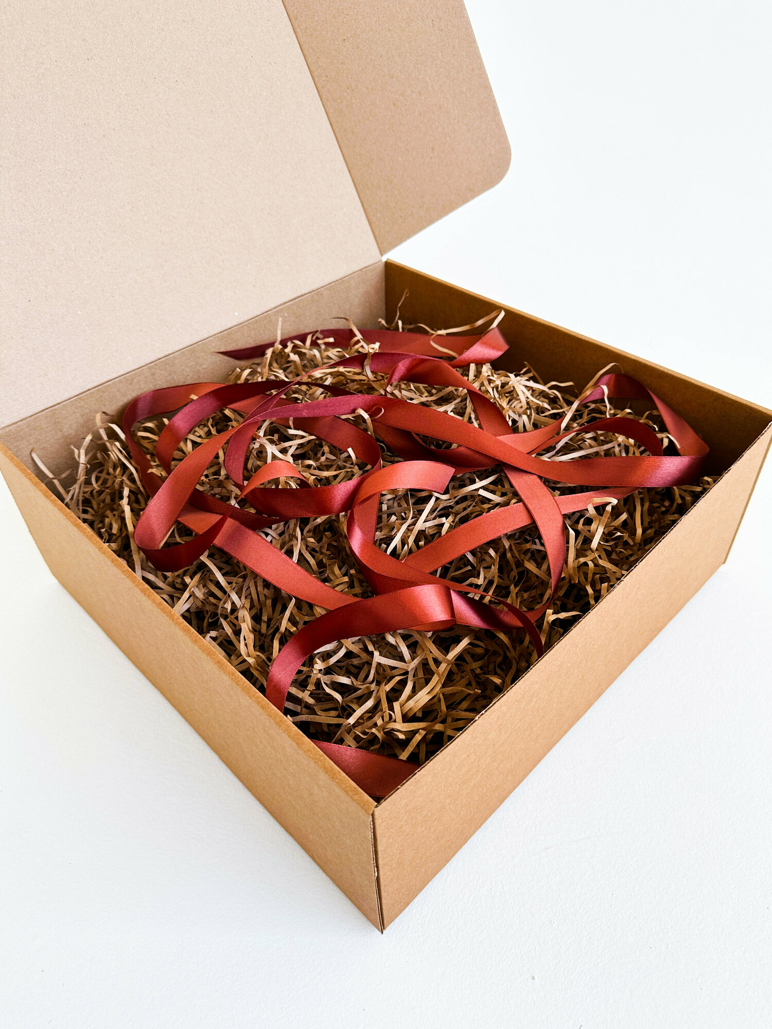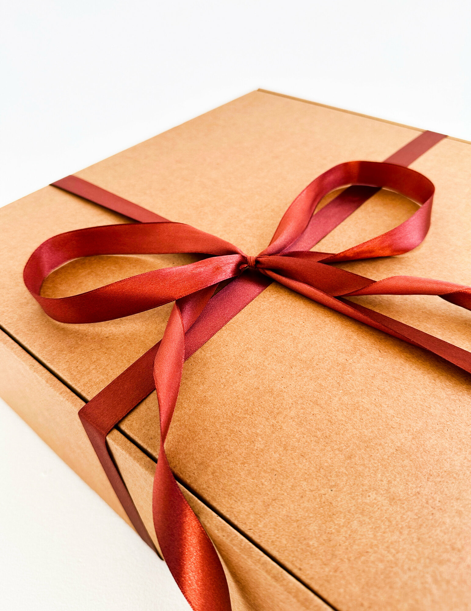 Большая подарочная коробка GILEV 37x37x14 см с бордовой лентой и наполнителем крафт