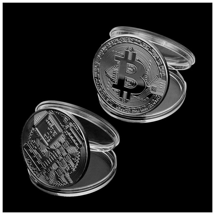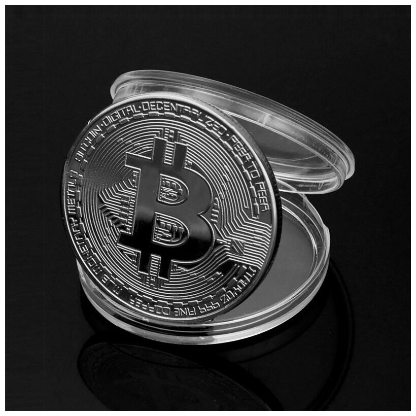Монета сувенирная подарочная Bitcoin BTC Биткоин (Серебро) в пластиковом прозрачном футляре и коробочке (d 4см, вес 15г) интересное: