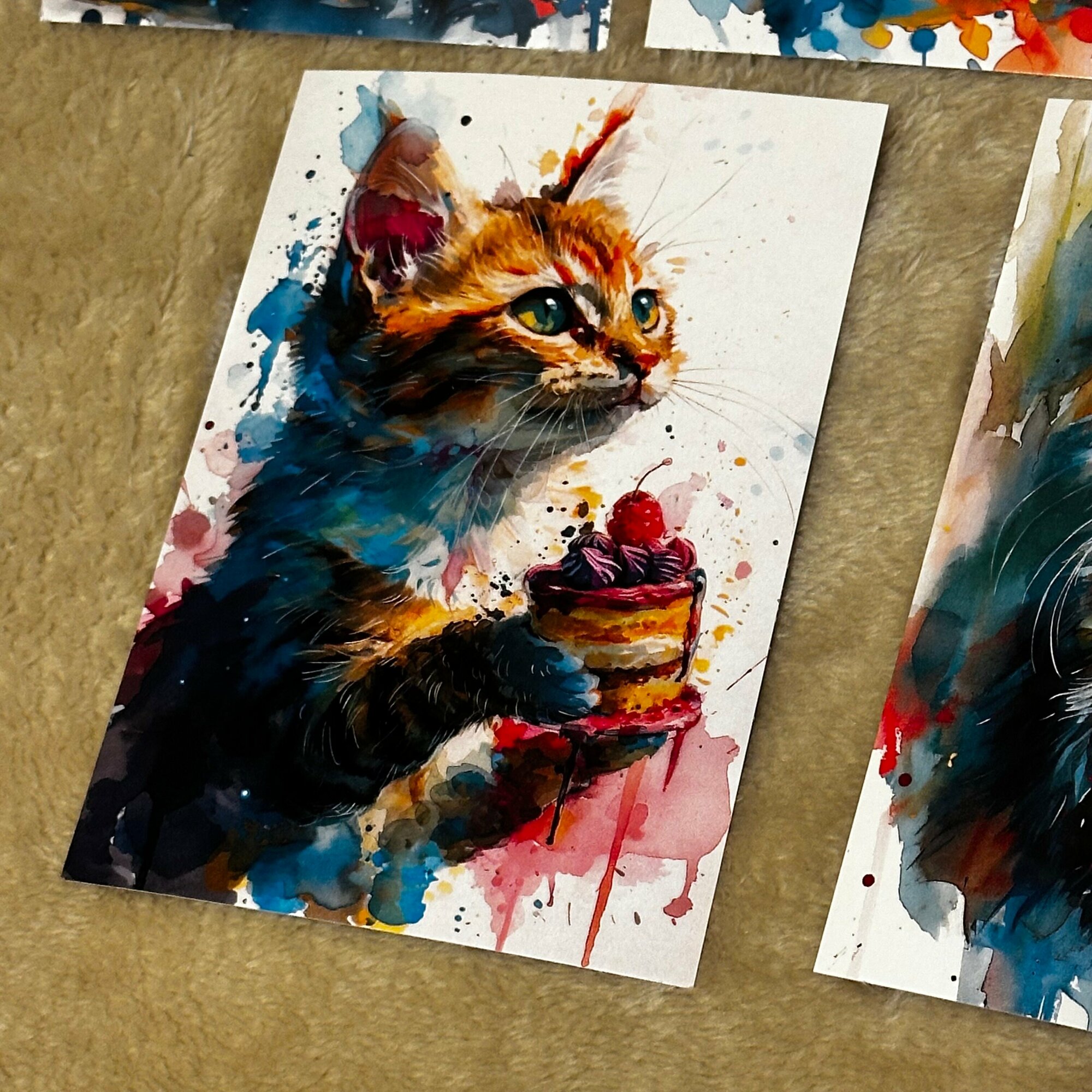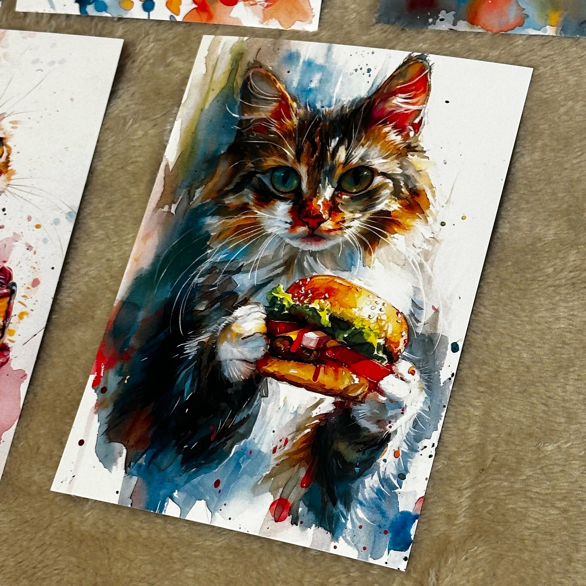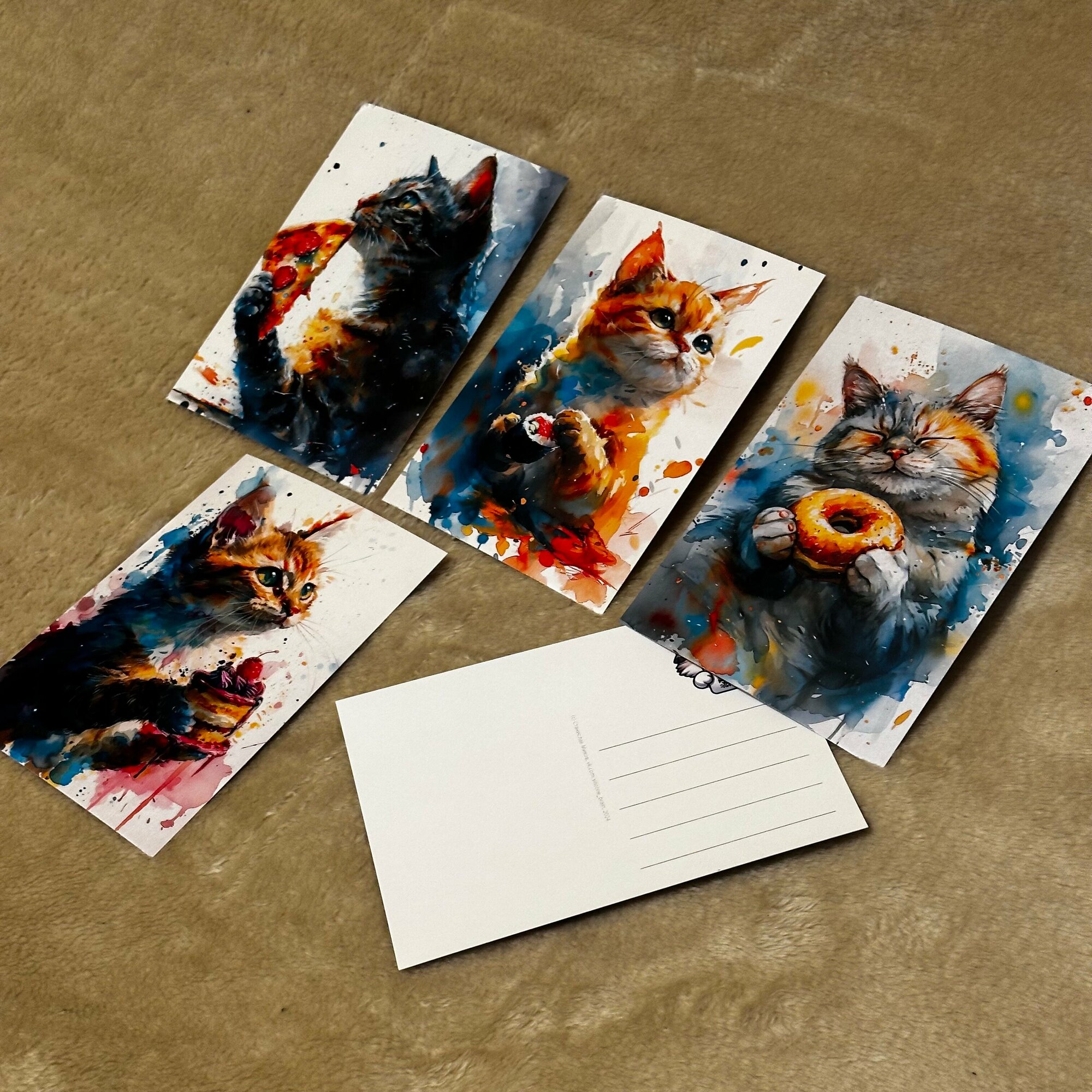 Купить Котики с едой: набор из 5 открыток в акварельном стиле для друзей и посткроссинга, добрые и милые иллюстрации, мини-постеры