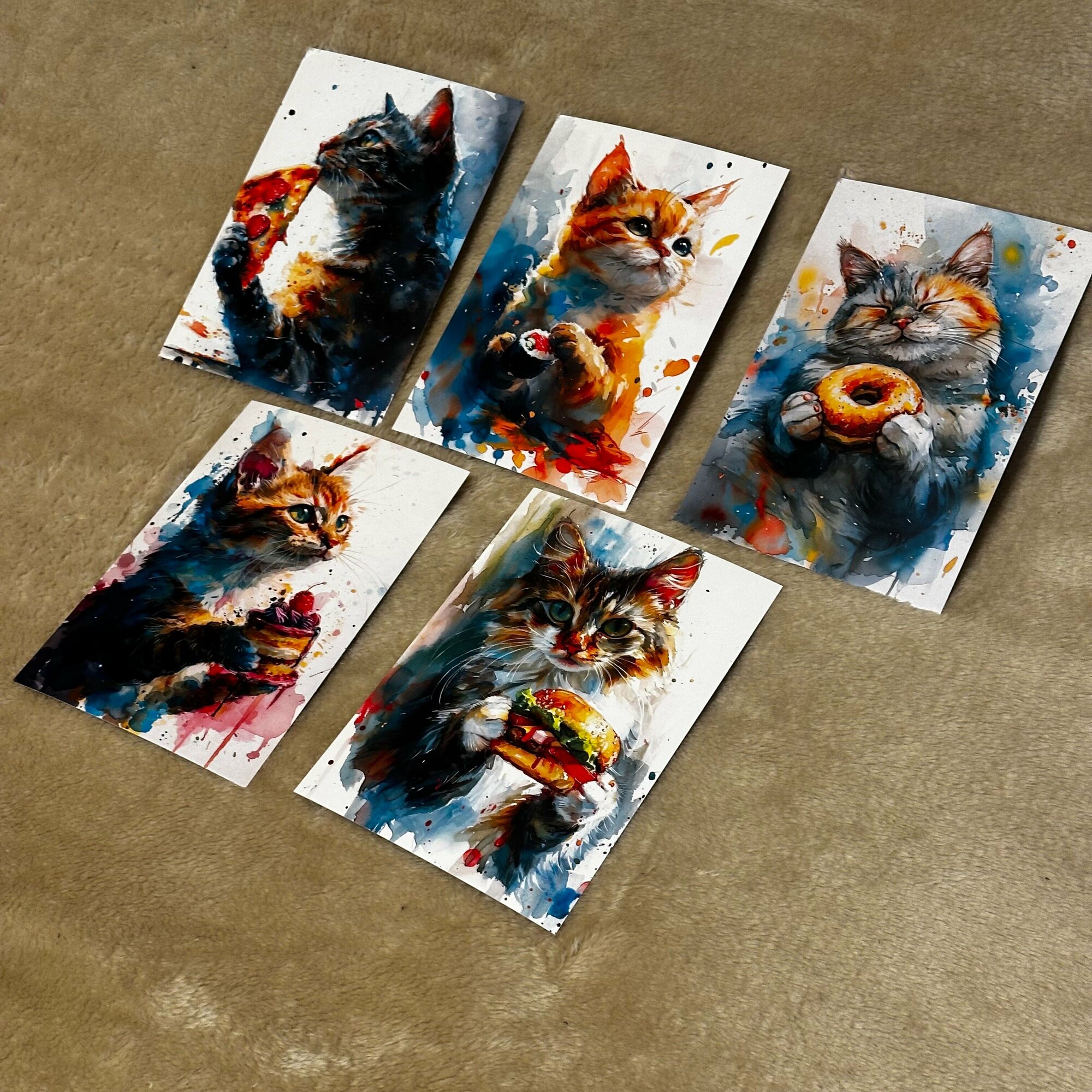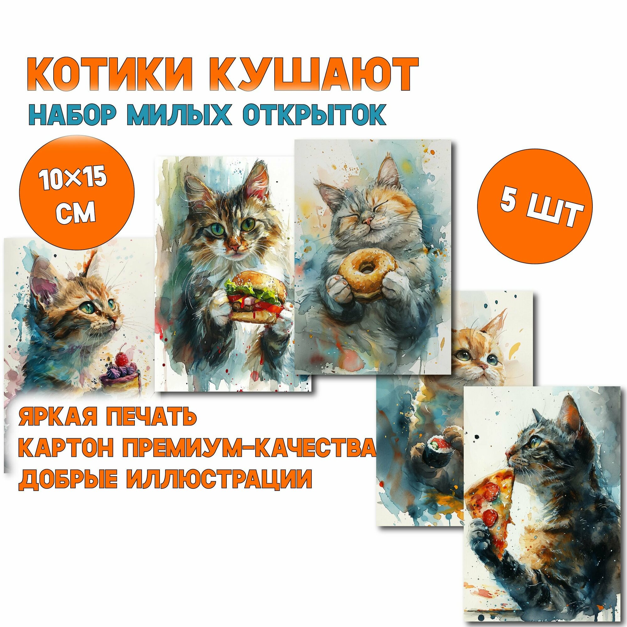 Котики с едой: набор из 5 открыток в акварельном стиле для друзей и посткроссинга, добрые и милые иллюстрации, мини-постеры интересное: