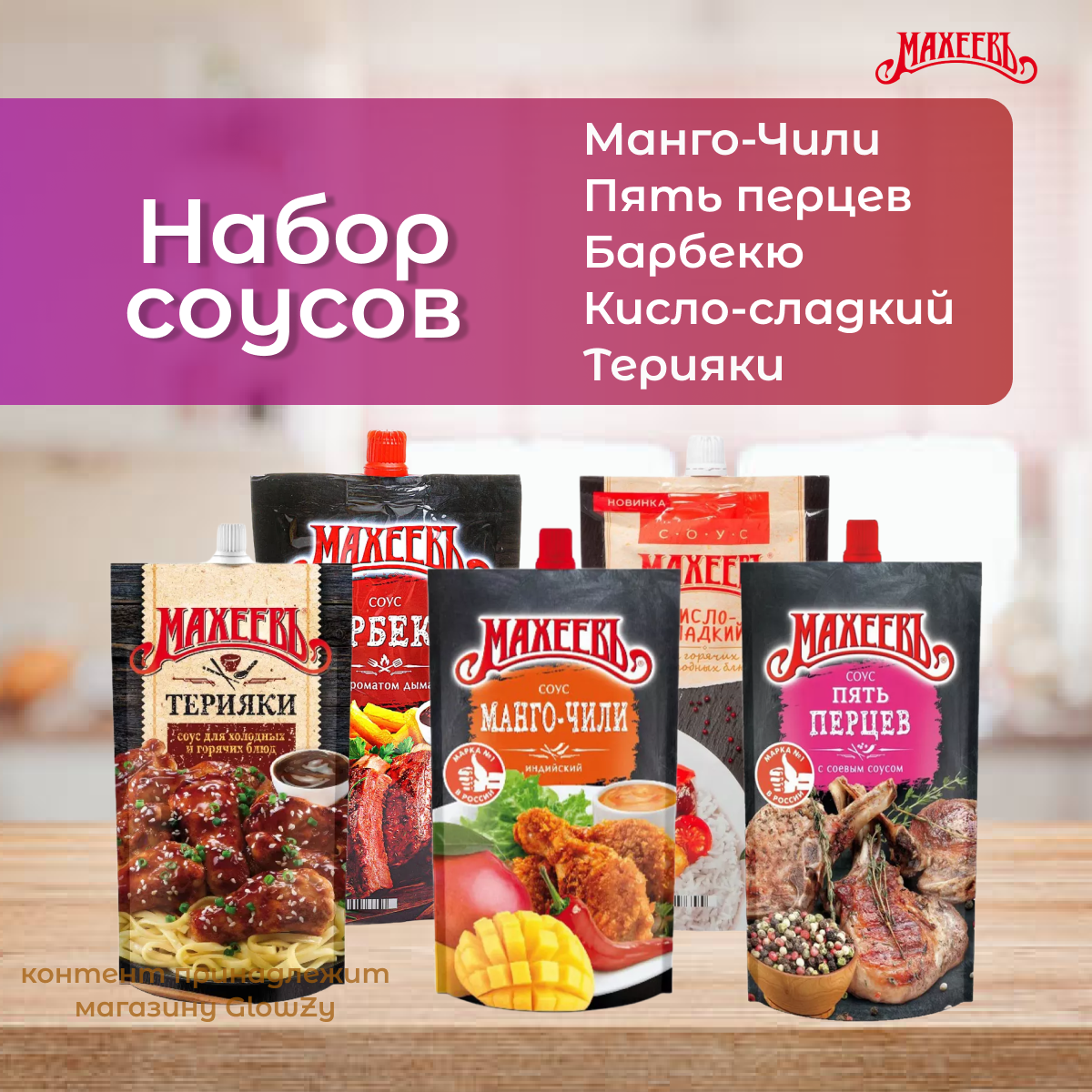 Махеевъ/ Набор соусов Деликатесный Барбекю, Кисло-сладкий, Манго-Чили, Пять перцев, Терияки по 230 г