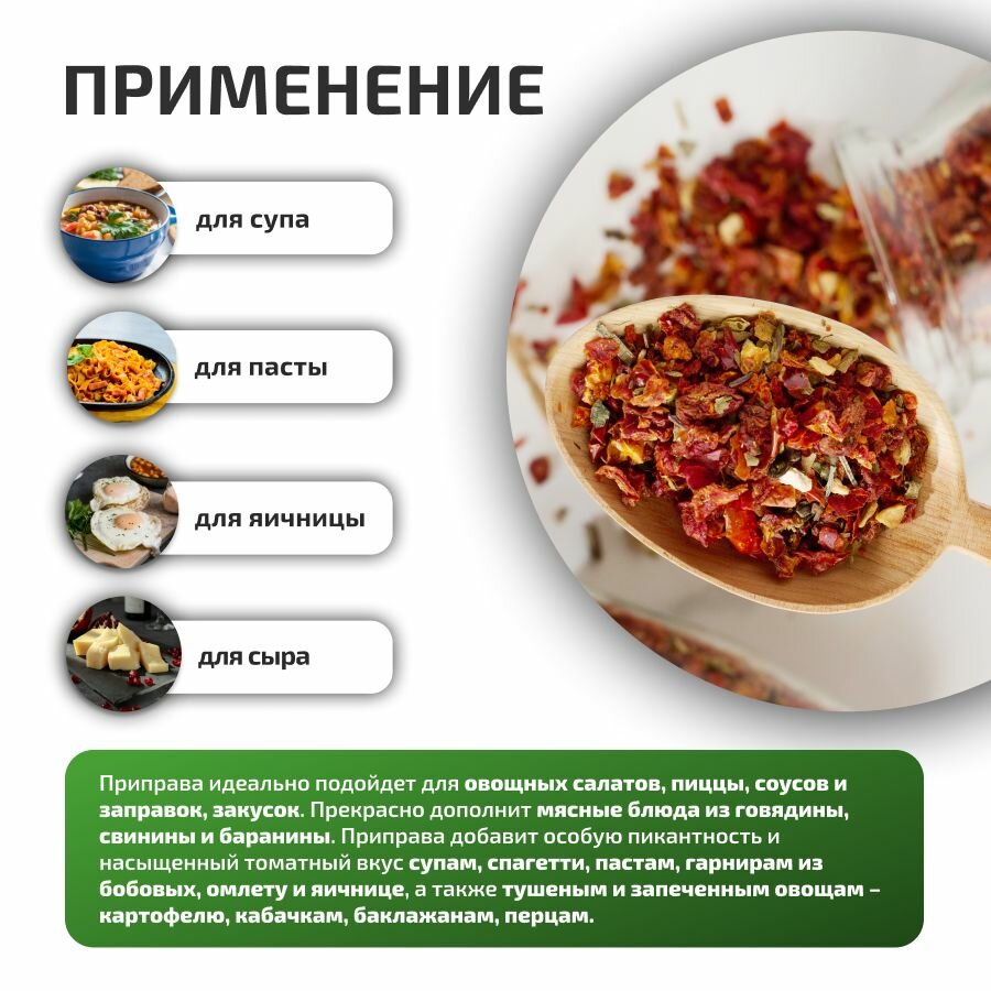 | Состав | Томаты сушеные, Чеснок, Базилик зеленый, Базилик фиолетовый |