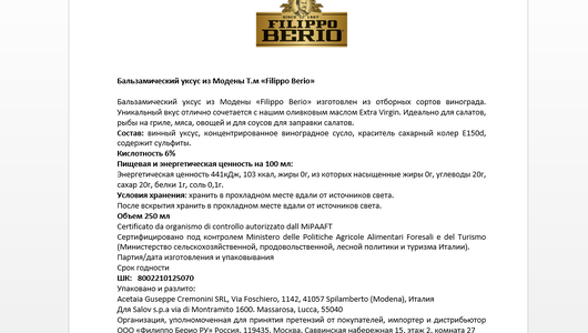 Уксус бальзамический FILIPPO BERIO, I.G.P. Modena, ст/б, 250 г интересное: