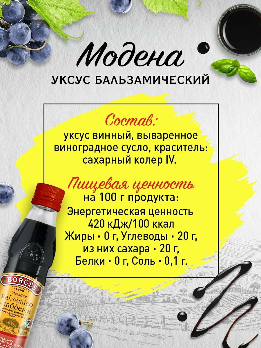 Ниже Вы можете прочитать отзывы на BORGES Уксус бальзамический Модена 250мл по 12 шт., ознакомится с подробными характеристиками, посмотреть интересные обзоры и фотографии на BORGES Уксус бальзамический Модена 250мл по 12 шт..