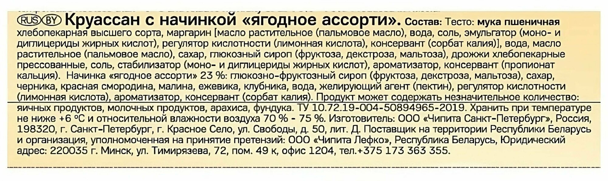 | Состав | тесто: мука пшеничная хлебопекарная высшего сорта, маргарин [масло растительное (пальмовое масло), вода, соль, эмульгатор (моно- и диглицериды жирных кислот), регулятор кислотности (лимонная кислота), консервант (сорбат калия)], вода, масло растительное (пальмовое масло), сахар, глюкозный сироп (фруктоза, декстроза, мальтоза), дрожжи хлебопекарные прессованные, соль, стабилизатор (моно- и диглицериды жирных кислот), ароматизатор, консервант (пропионат кальция). Начинка «ягодное ассорти» 23 %: глюкозно-фруктозный сироп (фруктоза, декстроза, мальтоза), сахар, черника, красная смородина, малина, ежевика, клубника, вода, желирующий агент (пектин), регулятор кислотности (лимонная кислота), ароматизатор, консервант (сорбат калия). Продукт может содержать незначительное количество: яичных продуктов, молочных продуктов, арахиса, фундука. ТУ 10.72.19-004-50894965-2019. |