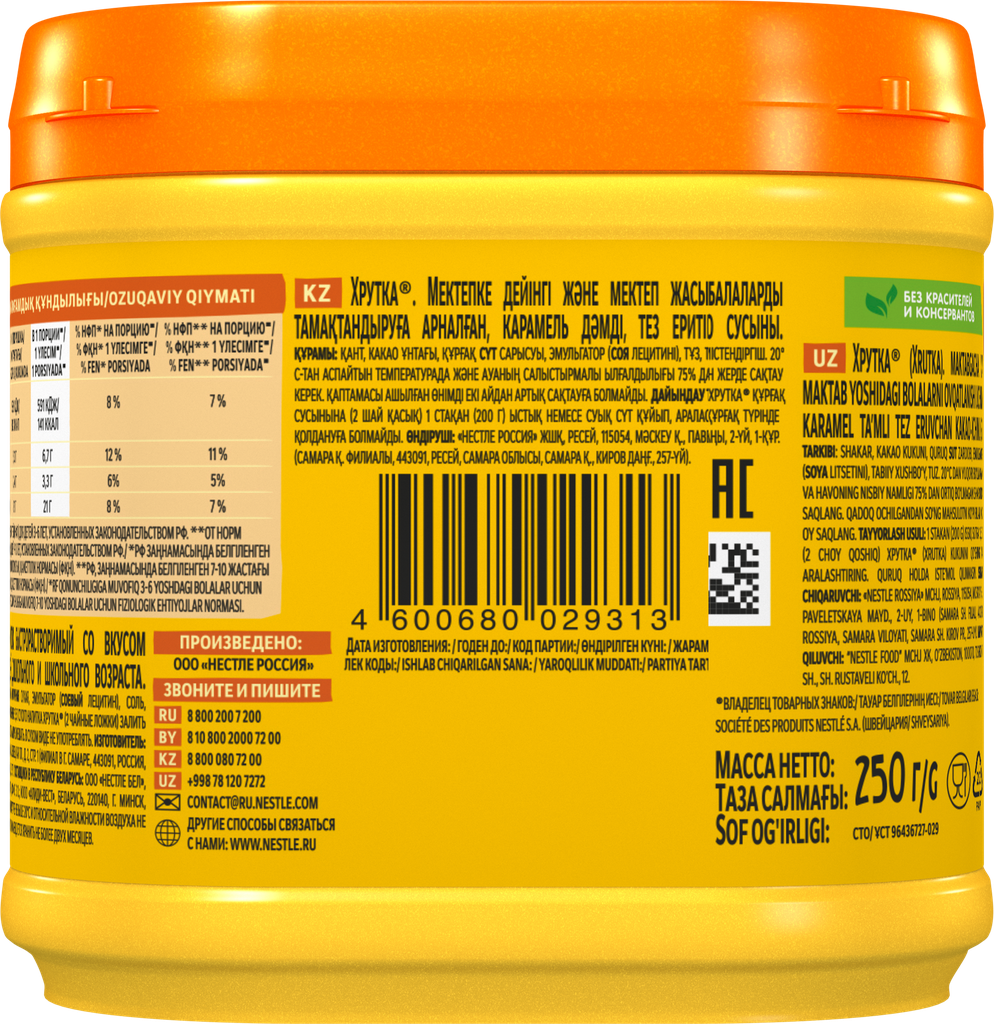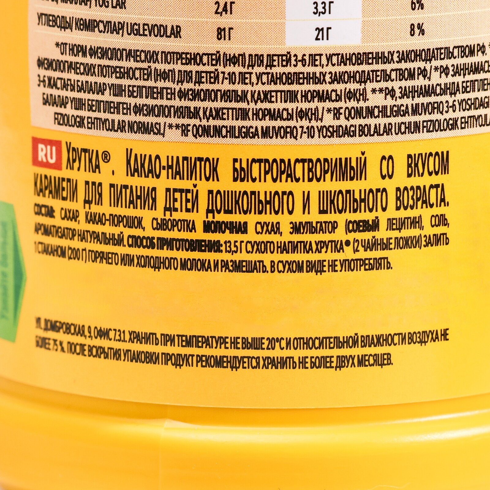 ХРУТКА. Банка 480г. Какао-напиток быстрорастворимый для питания детей дошкольного и школьного возраста.