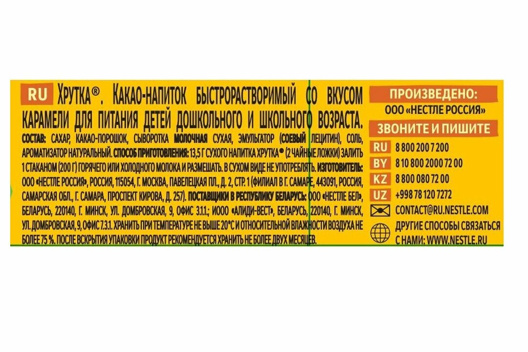 | Способ приготовления | 13,5 г сухого напитка Хрутка (2 чайные ложки) залить 1 стаканом (200г) горячего или холодного молока и размешать |
