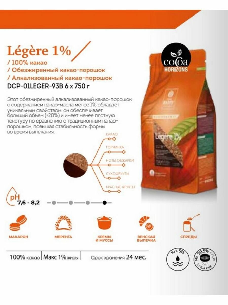 Купить Какао-порошок обезжиренный Legere 1%, 750г Франция