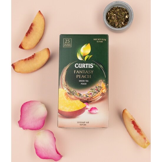 Чай зеленый в пакетиках CURTIS "Fantasy Peach" 25 пакетиков, c ароматом персика, лемонграссом и лепестками розы, мелколистовой интересное: