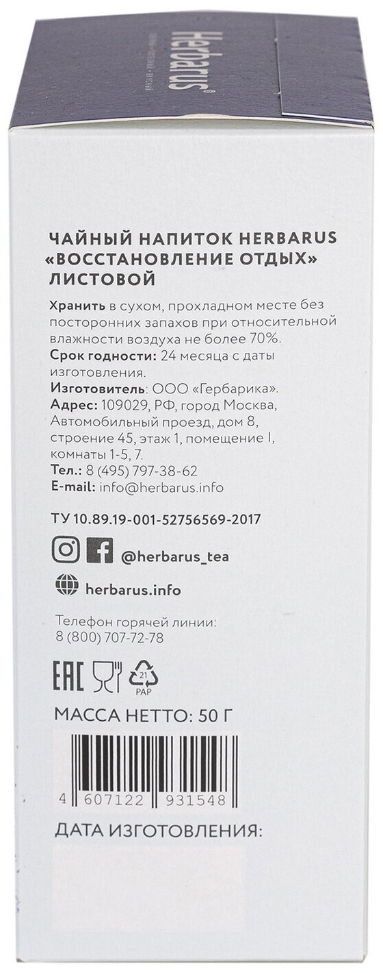 Чай из трав Herbarus Восстановление Отдых, листовой 50грамм интересное: